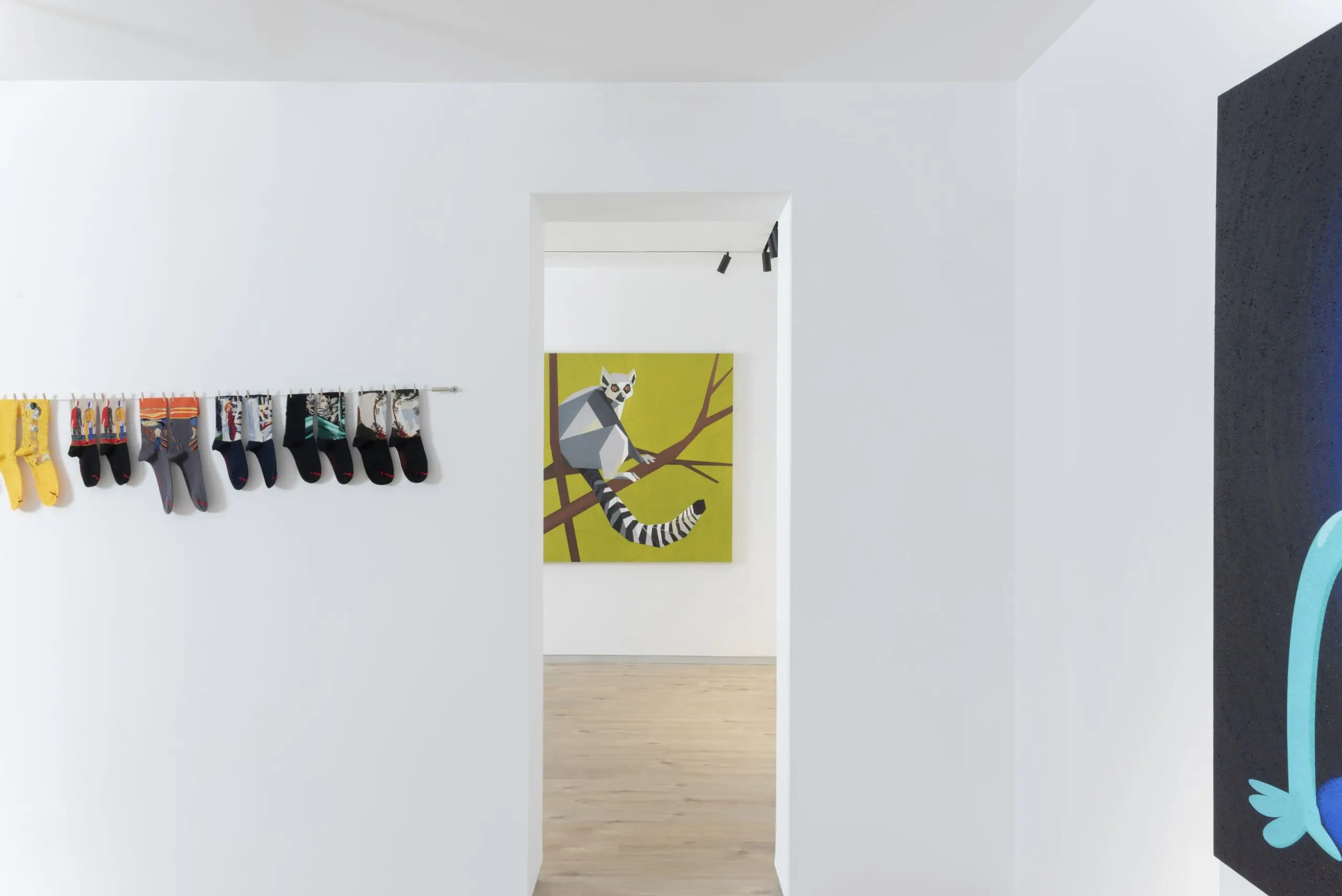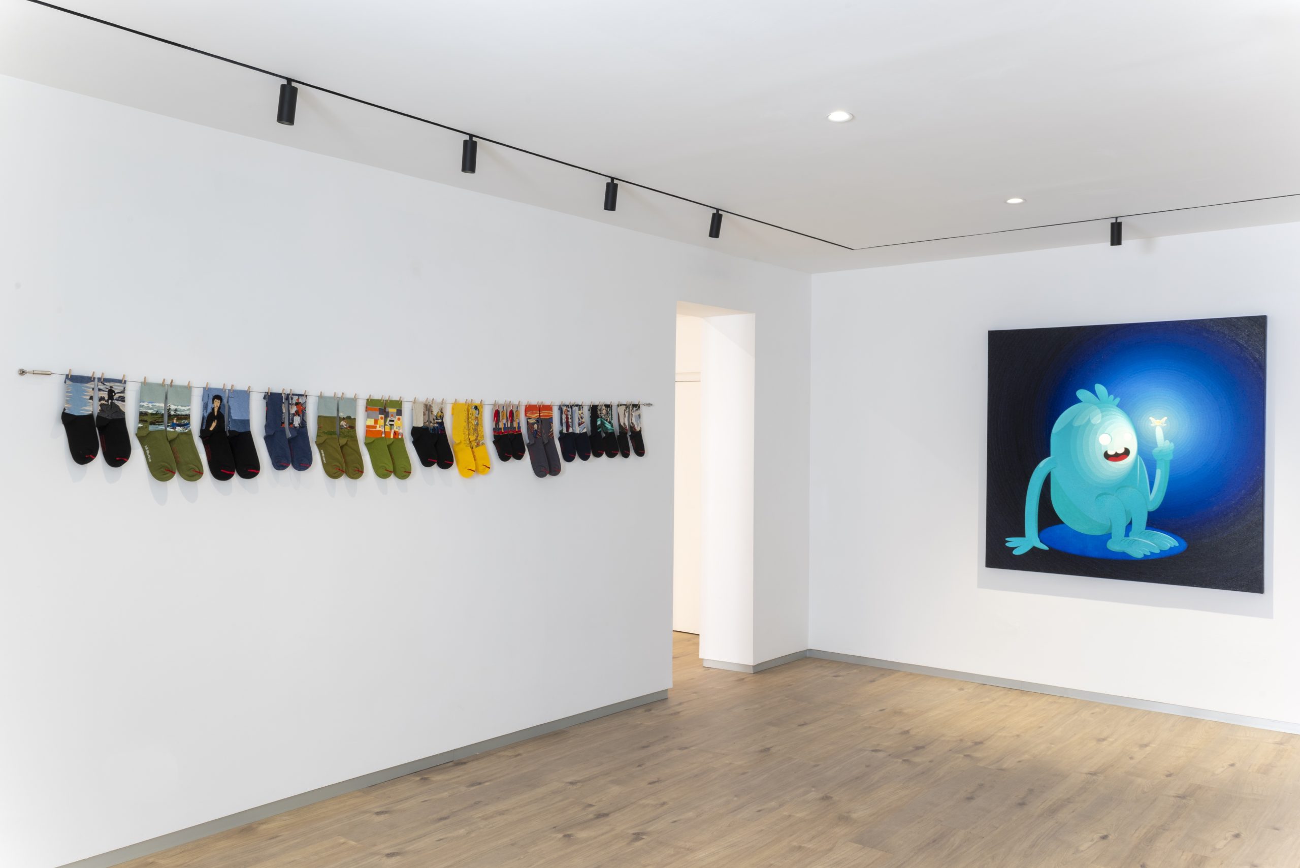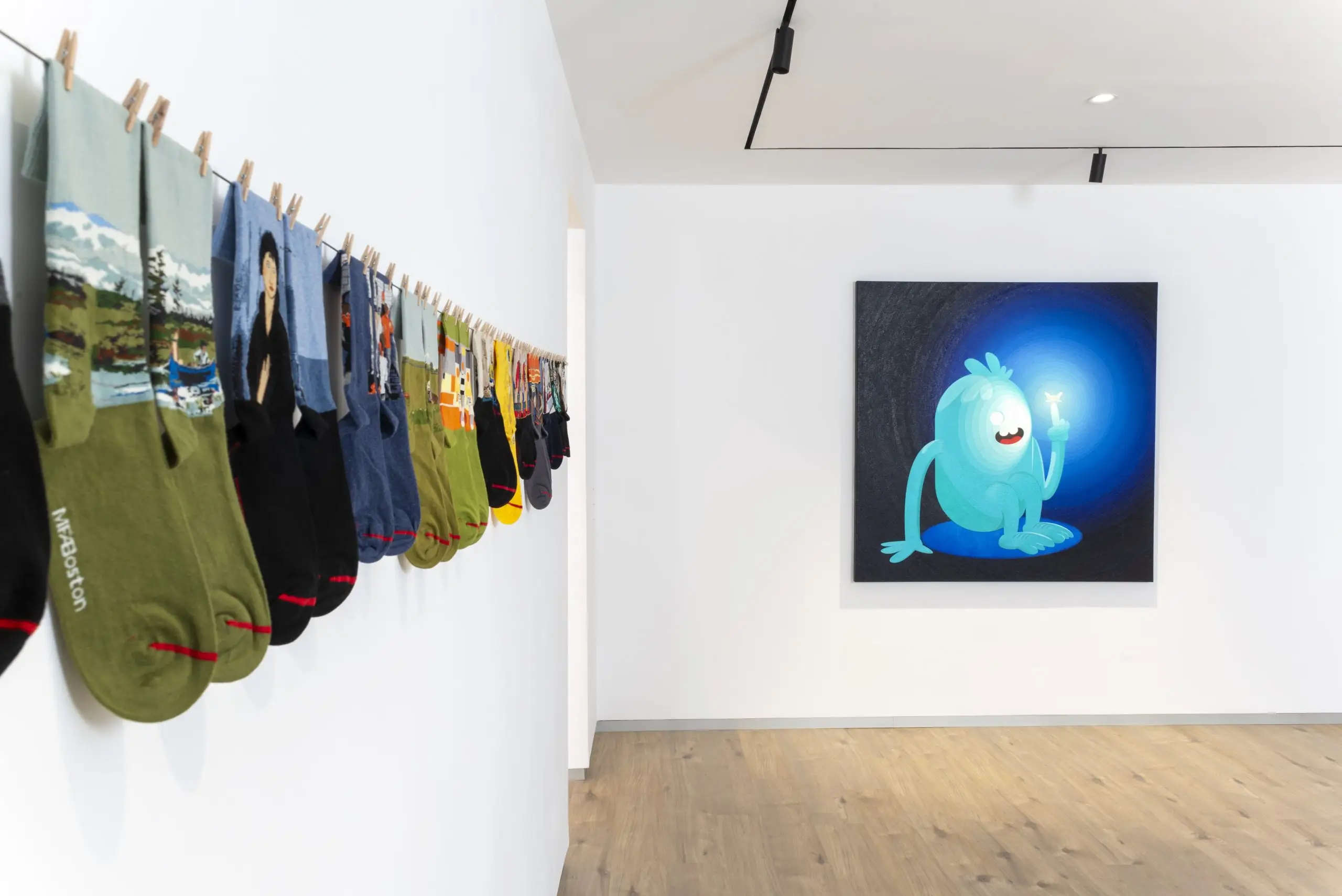 Otra arista del mismo fenómeno describe Acantilados blancos (2026): 15 pares de calcetines con adaptaciones de pinturas clásicas y modernas cuelgan de un tendedero. Su objeto de atención es el merchandising artístico, un procedimiento que transforma el arte y el diseño en narrativa coleccionable, bajo el simulacro de una democratización cultural. Simulacro porque, como pilar del marketing y la publicidad, reproduce los intereses de las industrias culturales. A diferencia del Constructivismo, que rechazó el arte decorativo y apostó por una belleza funcional y utilitaria al servicio de la sociedad, o de la Bauhaus, con su lema “la forma sigue a la función”, el merchandising traduce un empobrecimiento de la imaginación y la creatividad en su reproducción del original. El resultado es una adecuación de sus formas al estándar de una cultura de masas, enfocada en el consumidor más que en el ciudadano. El título de esta instalación no es fortuito, pertenece a un cuadro del pintor romántico Caspar David Friedrich, donde una mujer y dos hombres de espaldas, miran, indistintamente, el mar y el abismo. Una vez más la referencia sutil al abismo que deslumbra y mata.