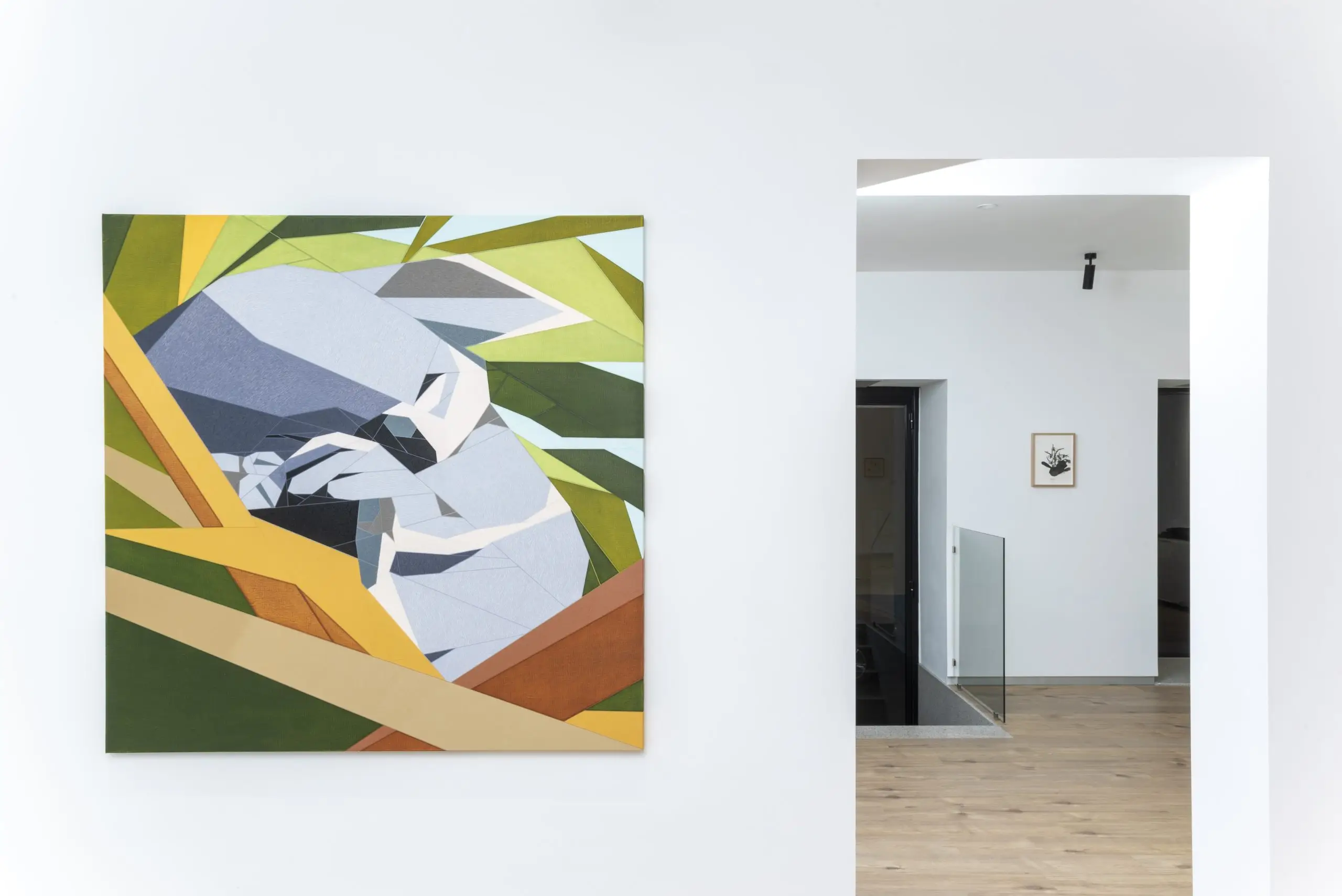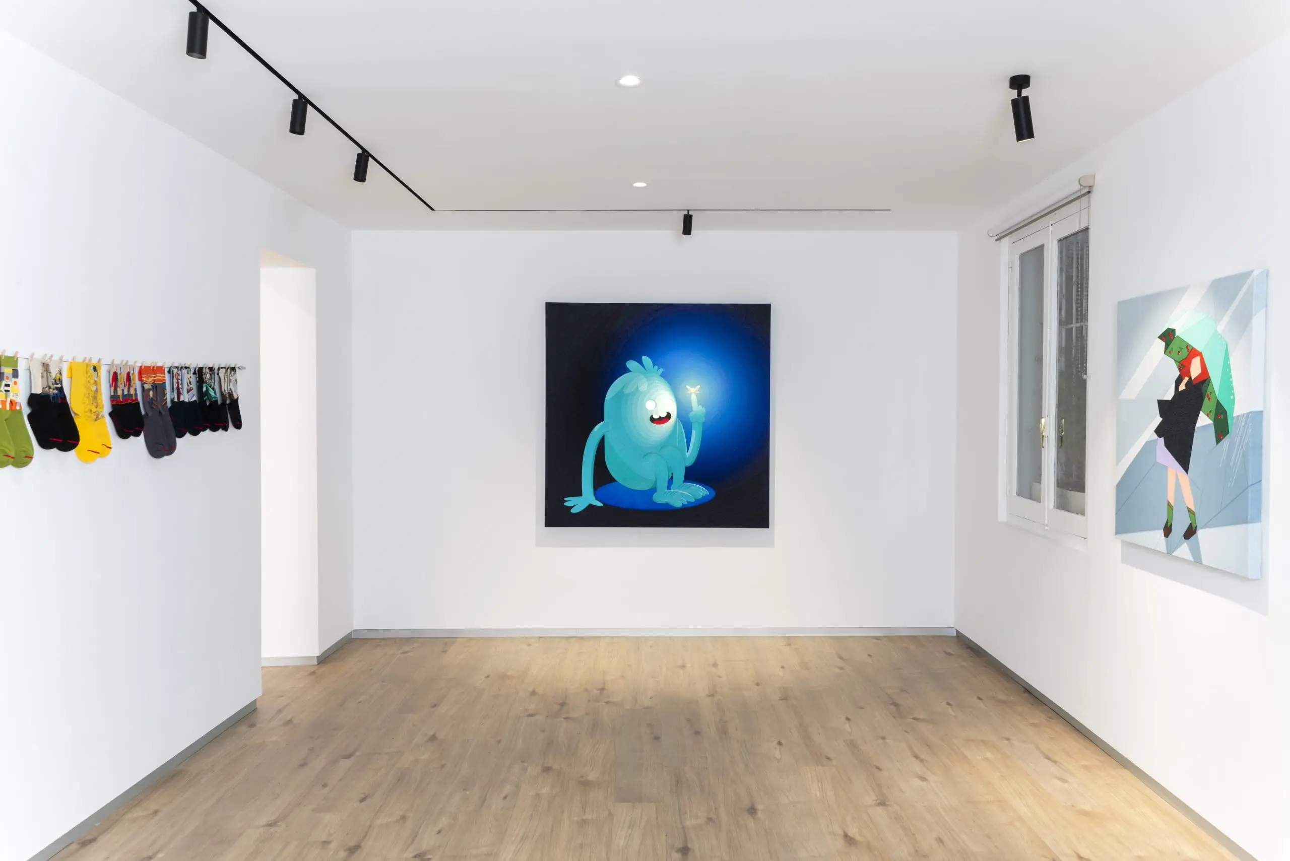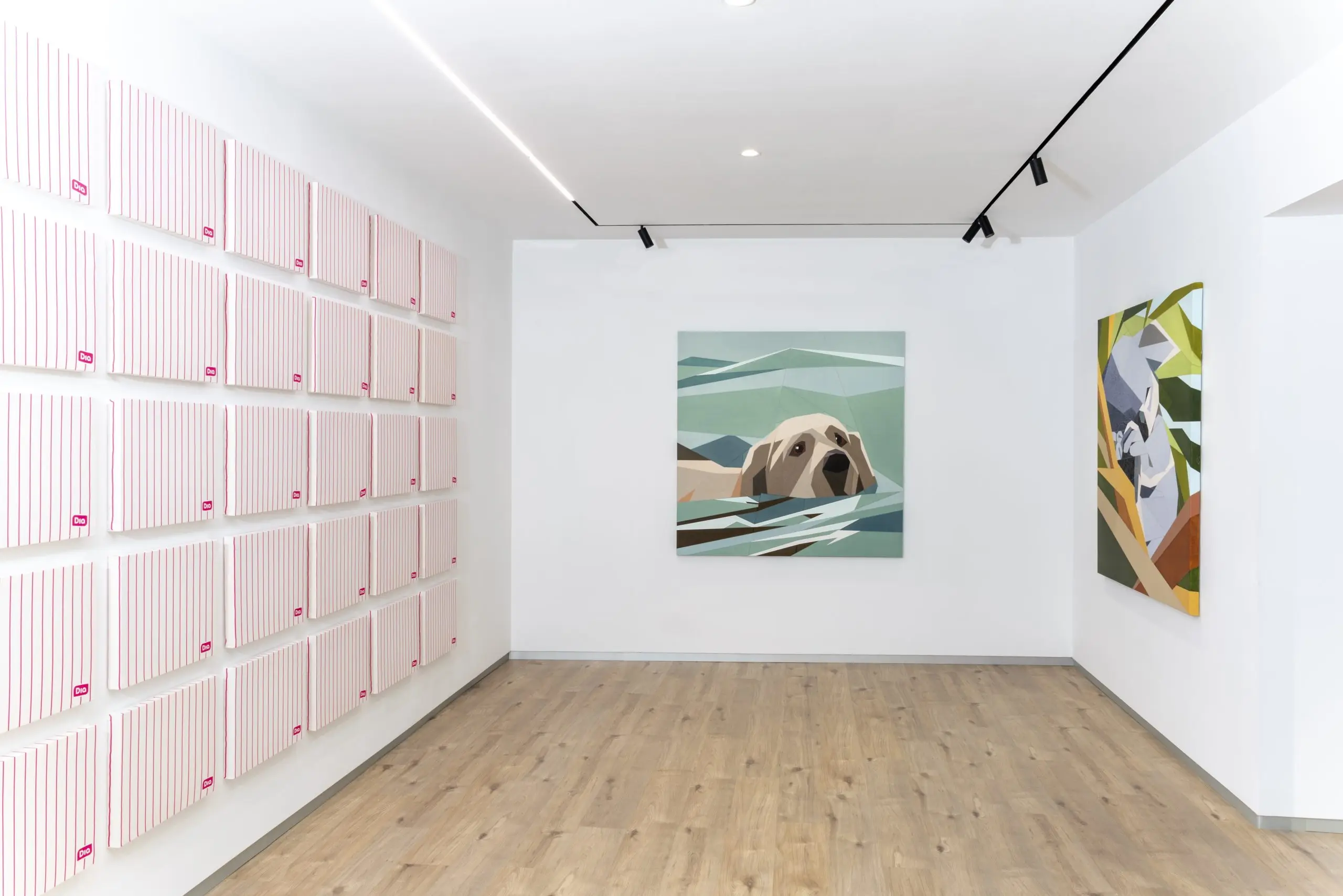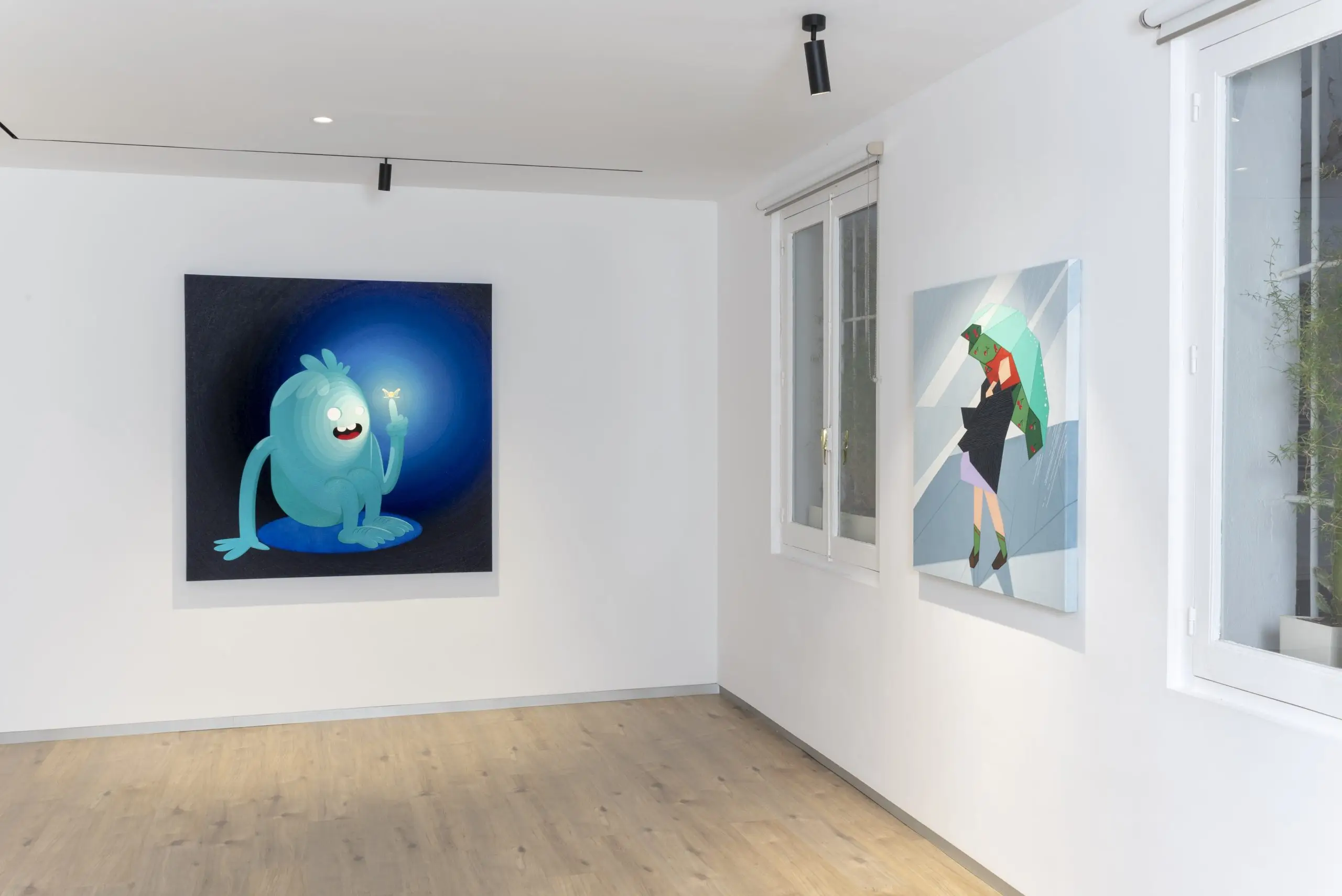 Apertura Ruy López responde a una evolución de dos exposiciones previas: País de nieve (2019), y Cartas a Théo (2022). Con ellas estableció una línea de trabajo donde se adueñó de vectores, mockups, plugins…, productos digitales creados para apps, redes sociales, marketing, publicidad, etc., y los materializó a través del óleo. Prototipos, cuya construcción en capas, permite editar múltiples variantes y agilizar los tiempos de producción y entrega del diseño contemporáneo. Su visualidad kitsch, estereotipada e ideal respecto al referente, encontró en Ponjuán a un ejecutor impecable por una erótica de la pintura que remeda la factura digital print.