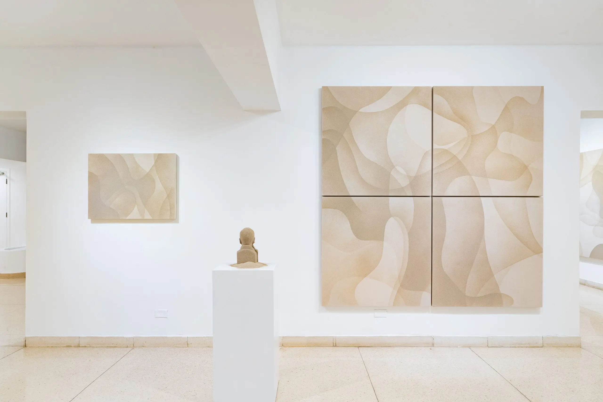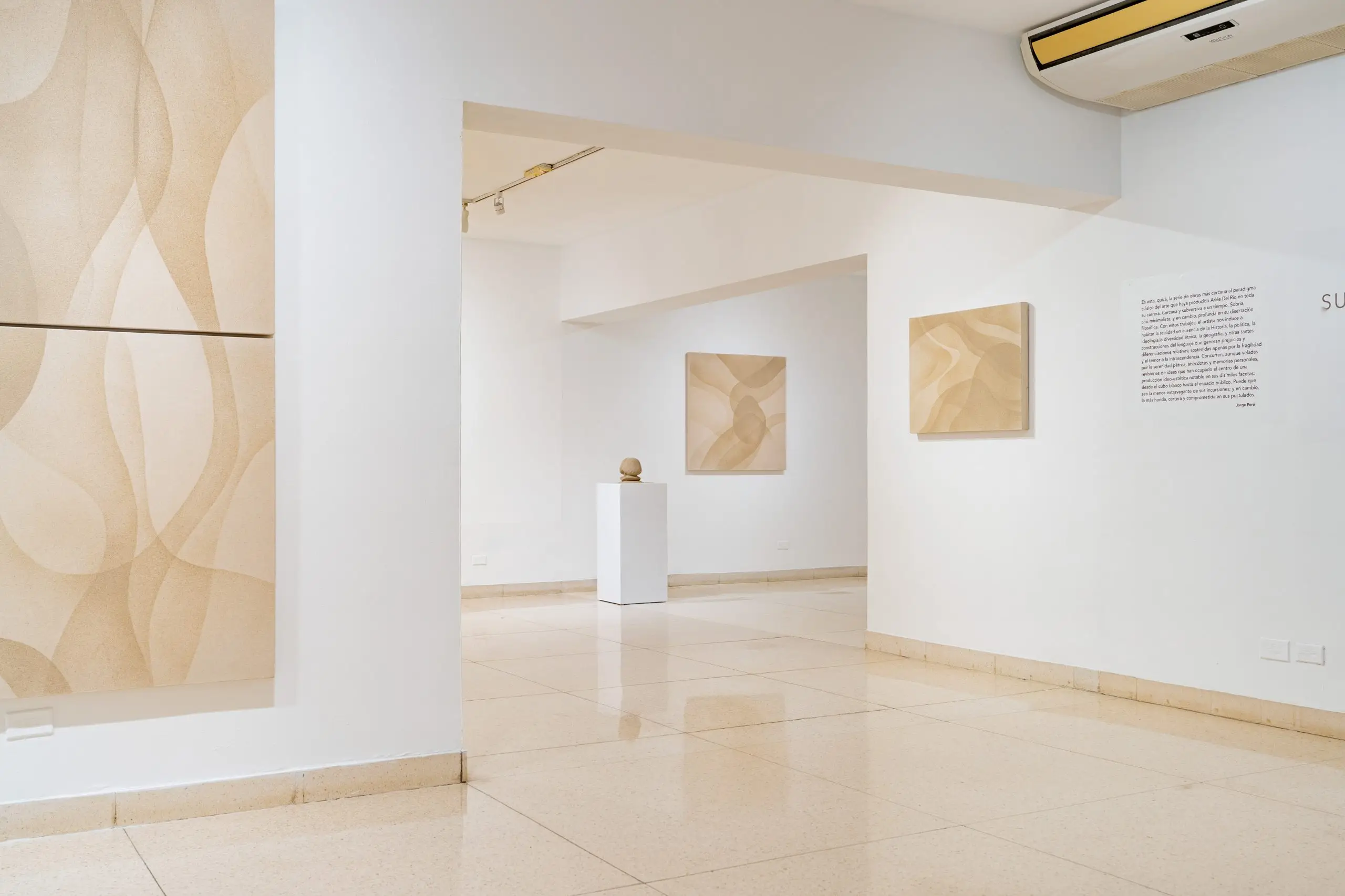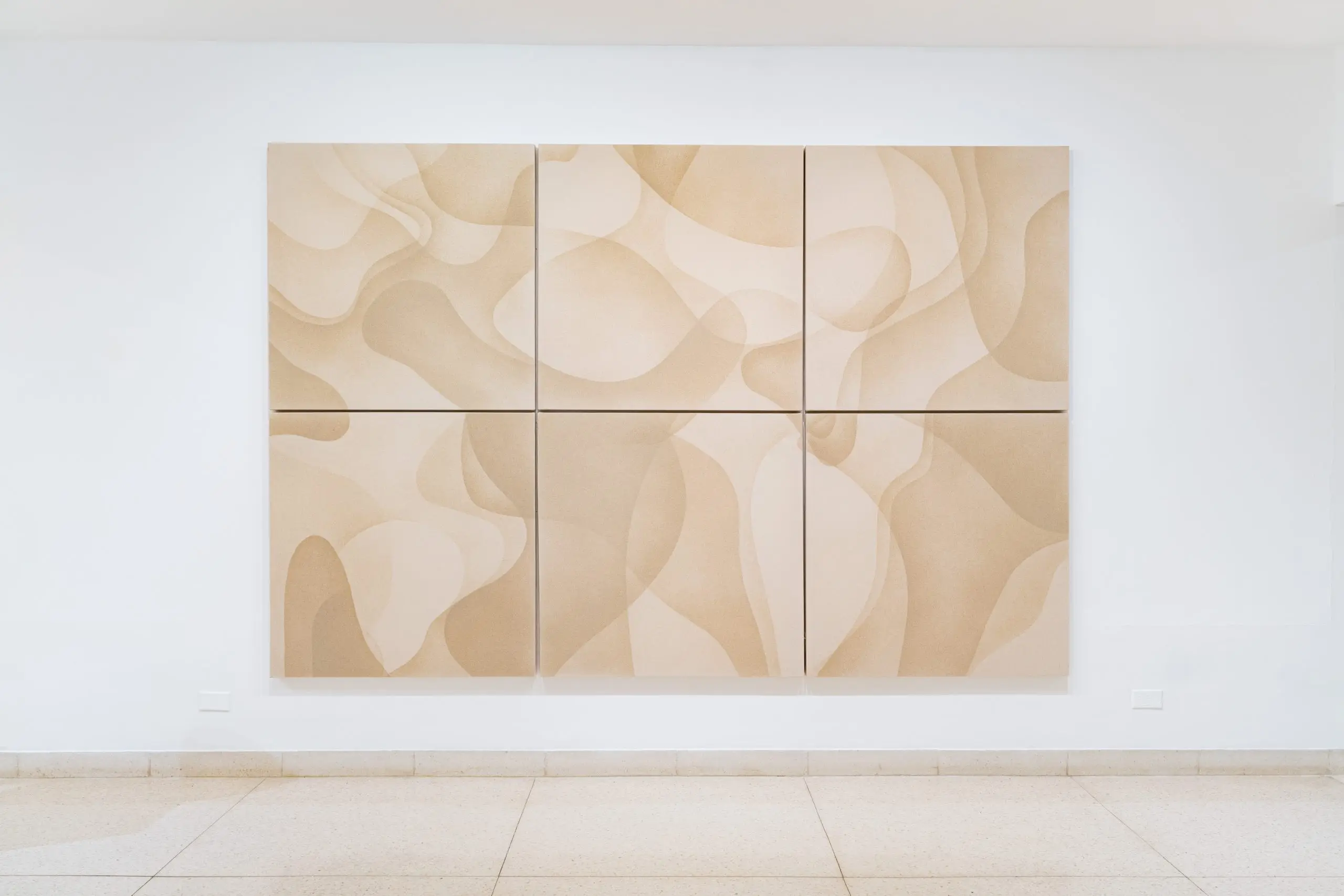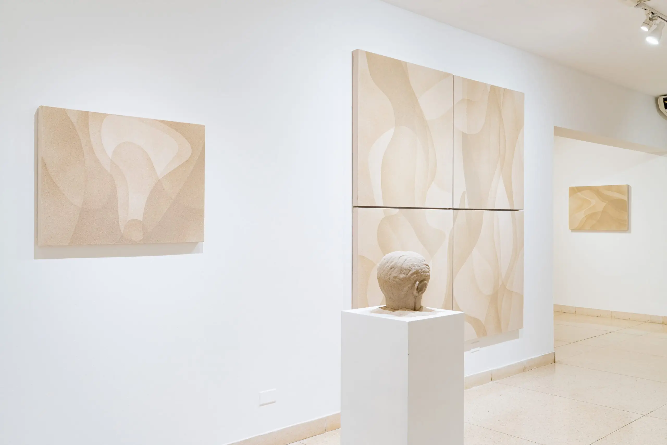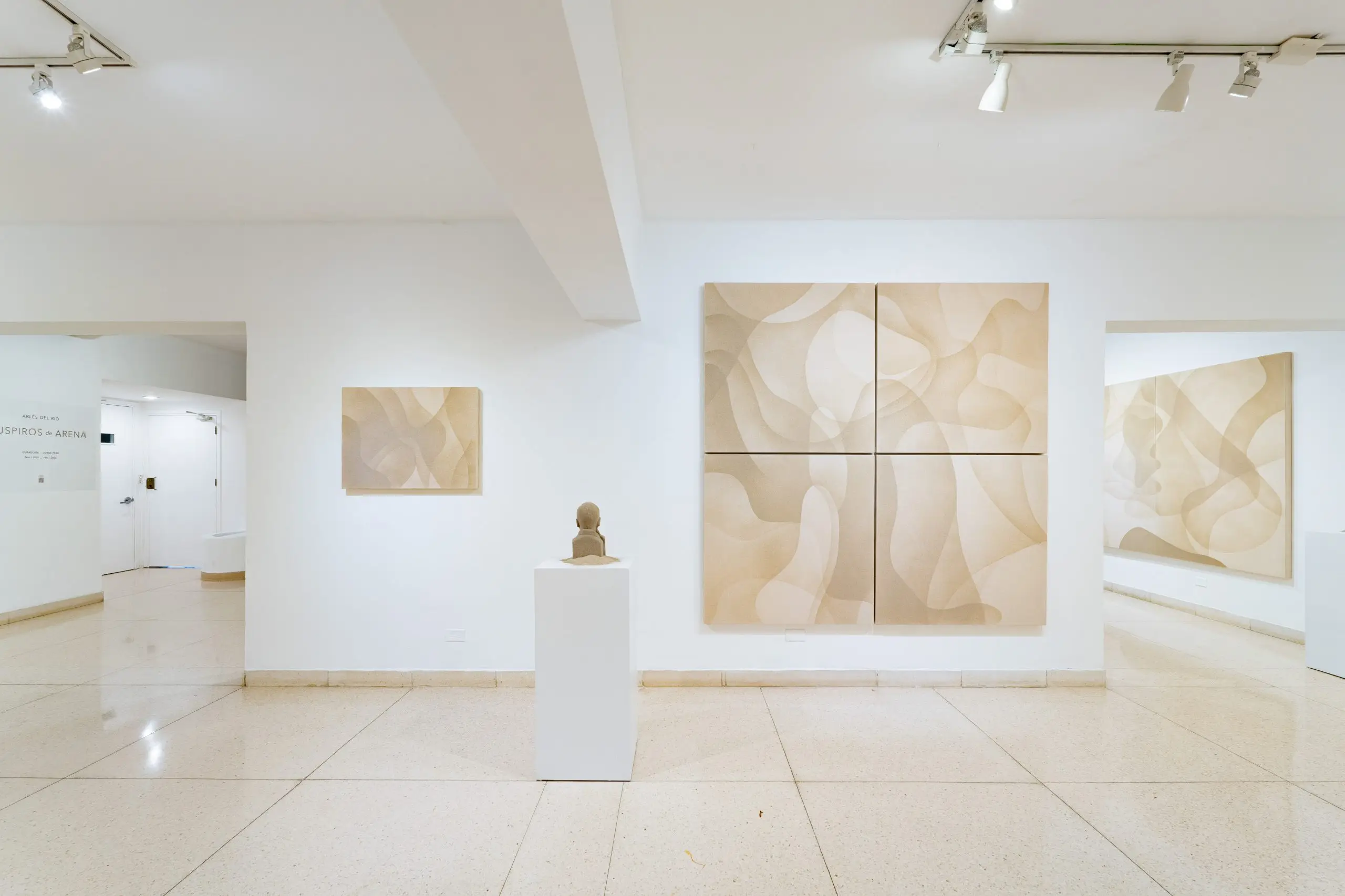 “Suspiros de arena” nasce da un gesto che si definisce tra il primario e il meditativo: prendere la sabbia tra le mani e lasciarla cadere intenzionalmente sulla tela grezza, come se ogni forma fosse un respiro sospeso, un sospiro che fissa l'istante. Questa tecnica evoca il ritmo organico della respirazione: inspirare, espirare; prendere, lasciare andare; esistere.