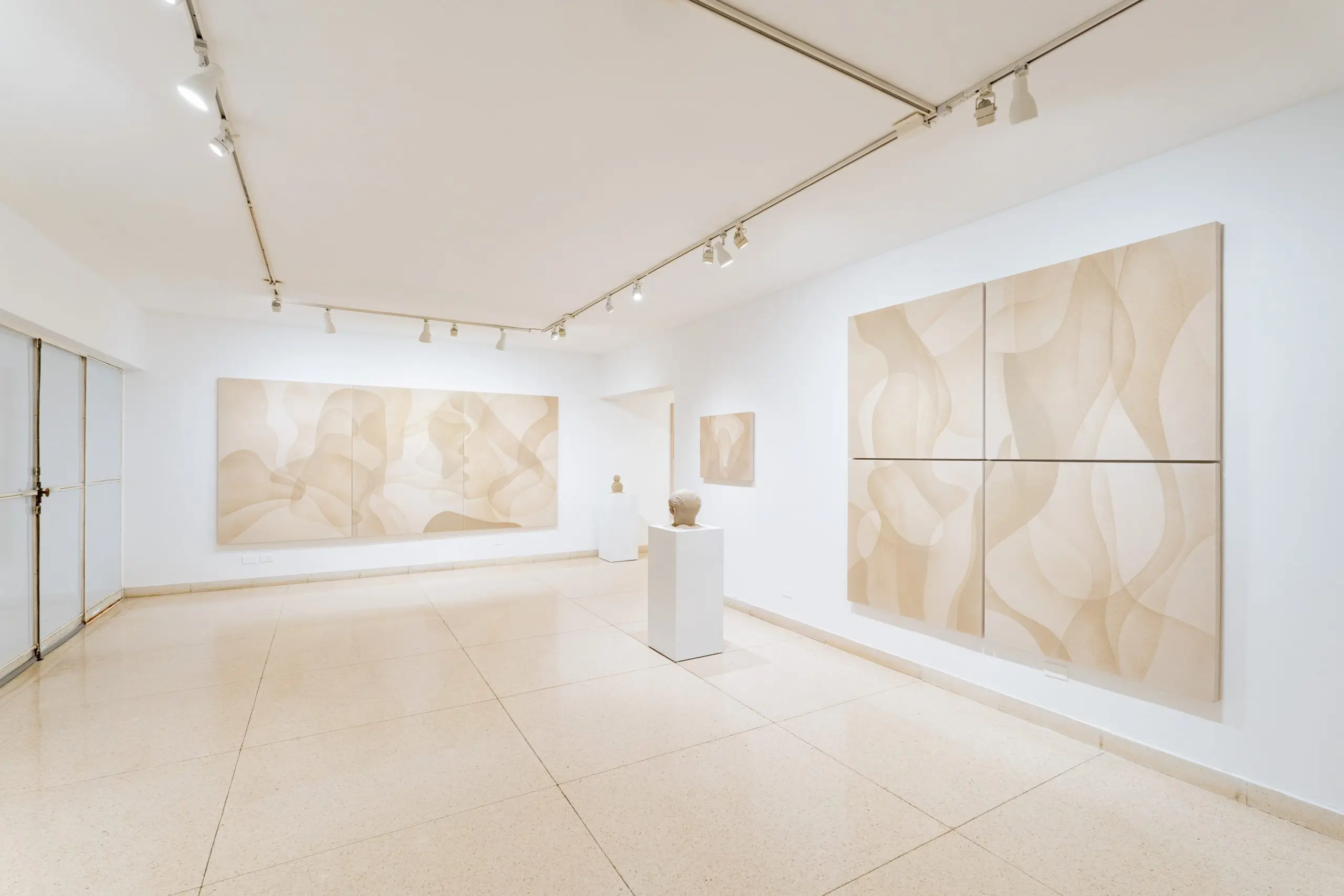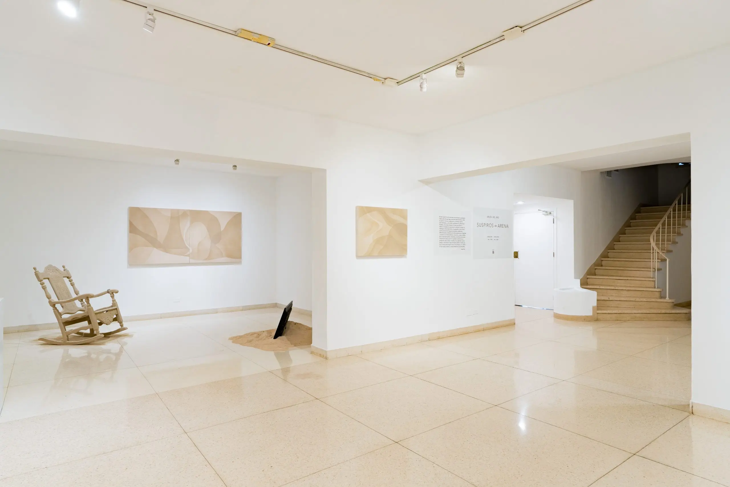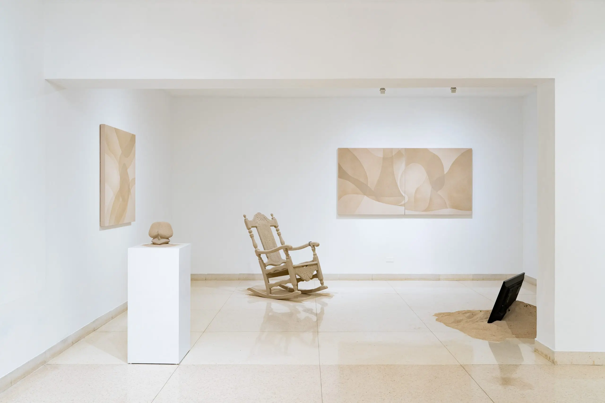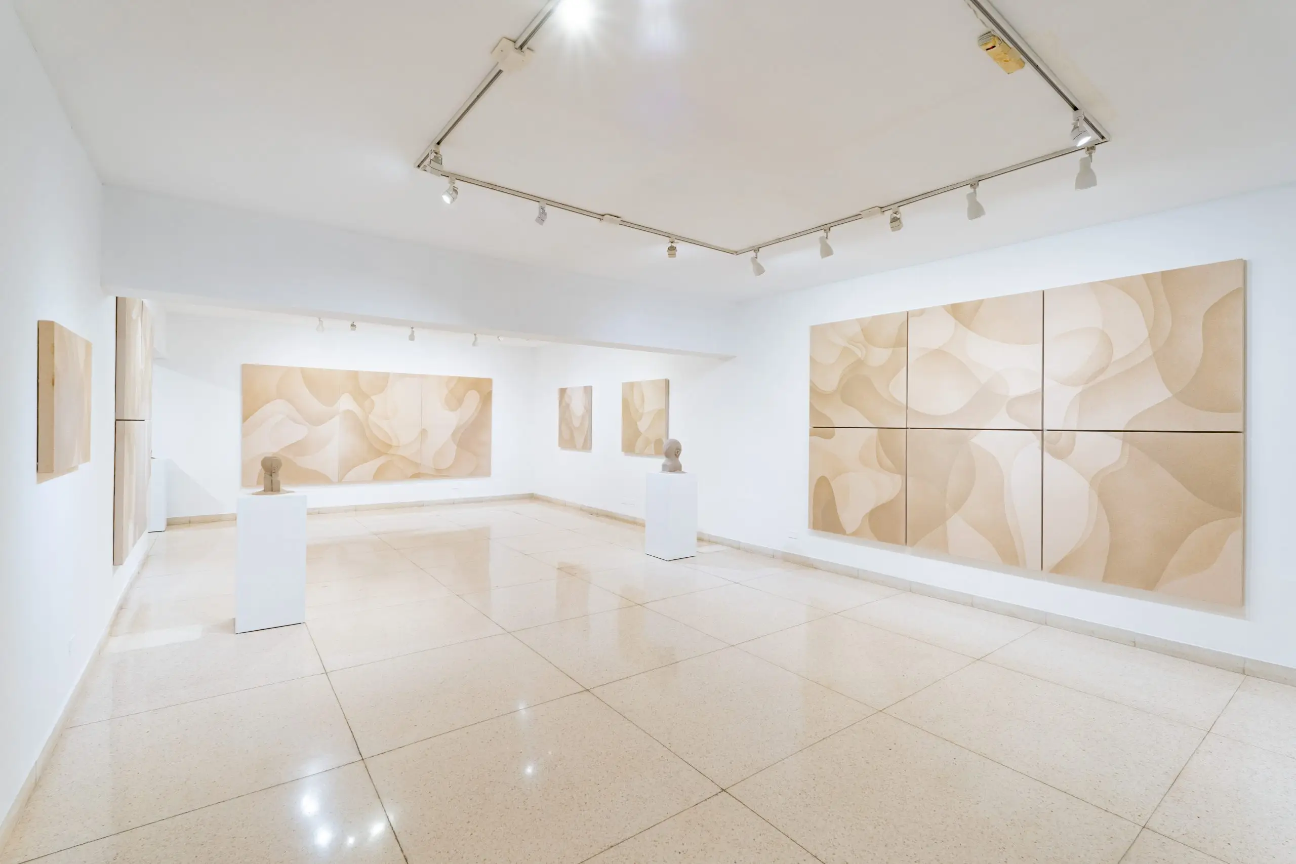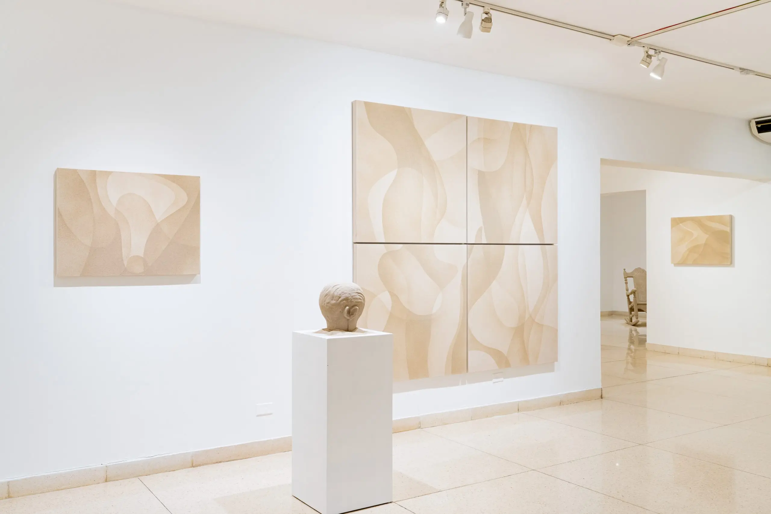 “Suspiros de arena” nasce da un gesto che si definisce tra il primario e il meditativo: prendere la sabbia tra le mani e lasciarla cadere intenzionalmente sulla tela grezza, come se ogni forma fosse un respiro sospeso, un sospiro che fissa l'istante. Questa tecnica evoca il ritmo organico della respirazione: inspirare, espirare; prendere, lasciare andare; esistere.