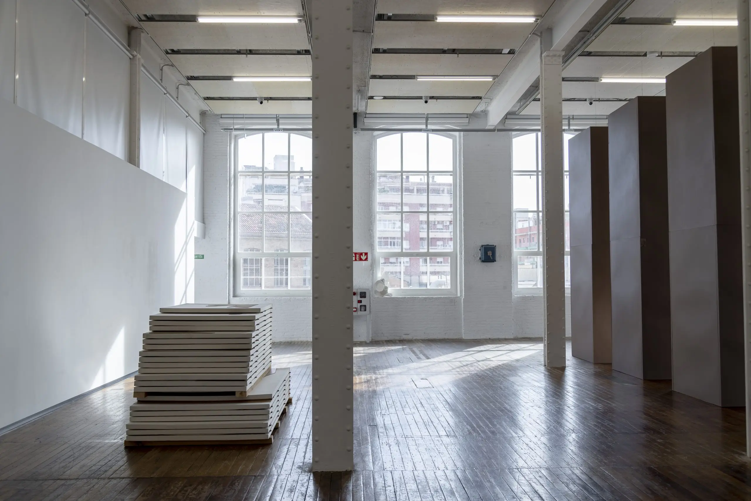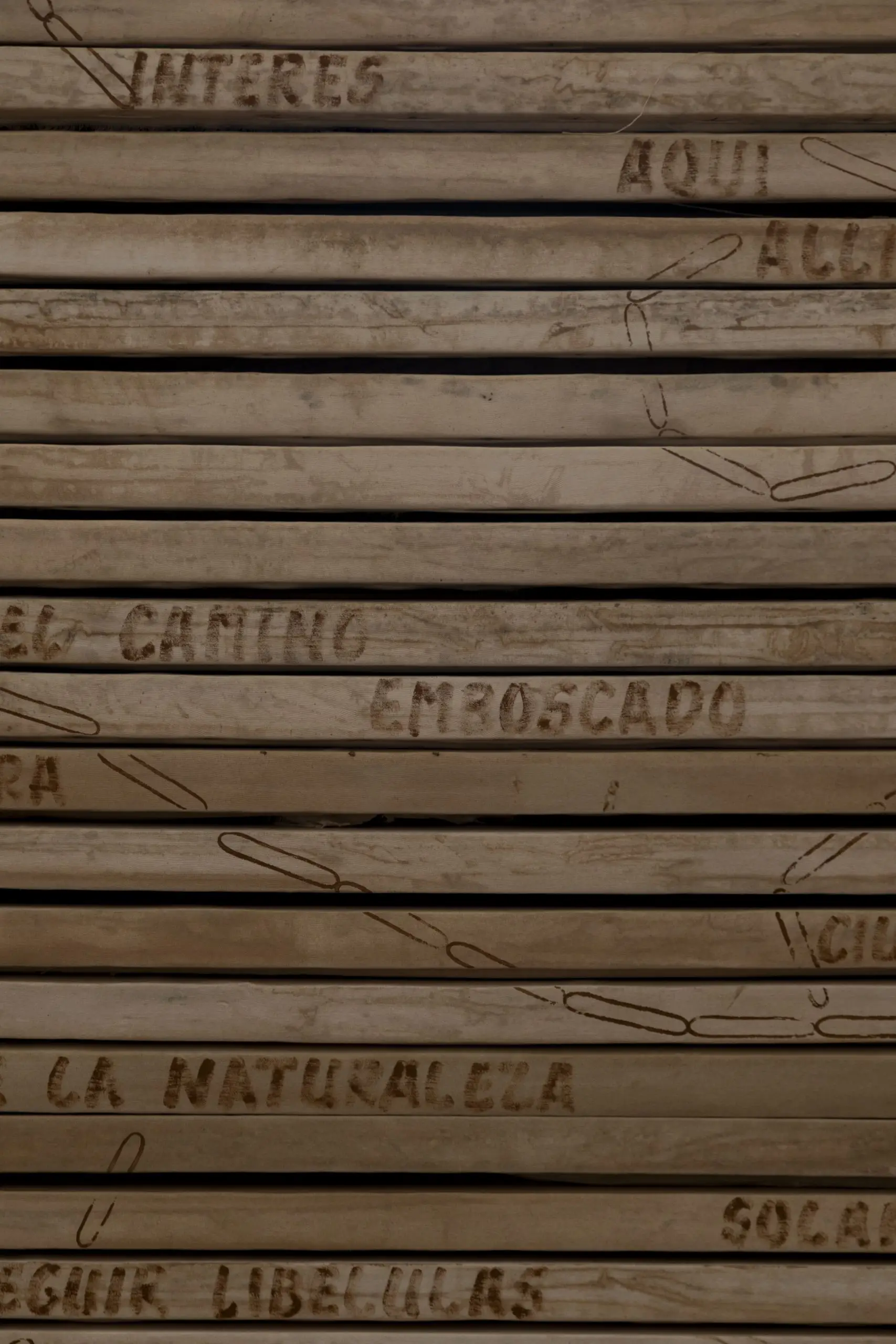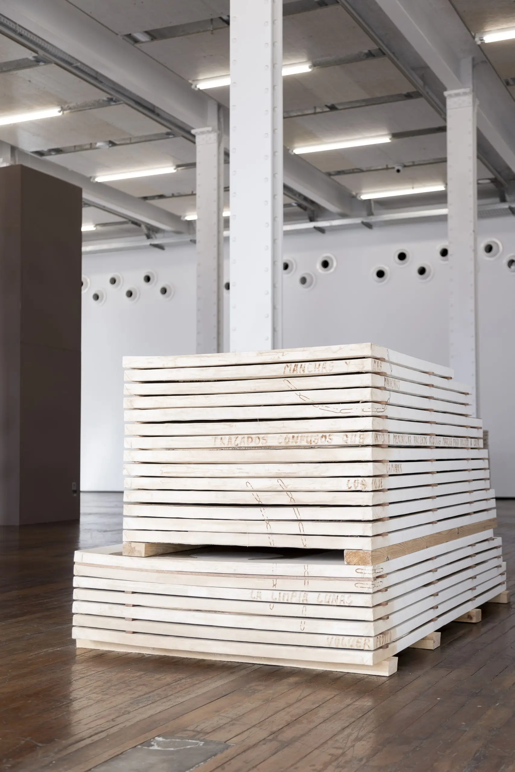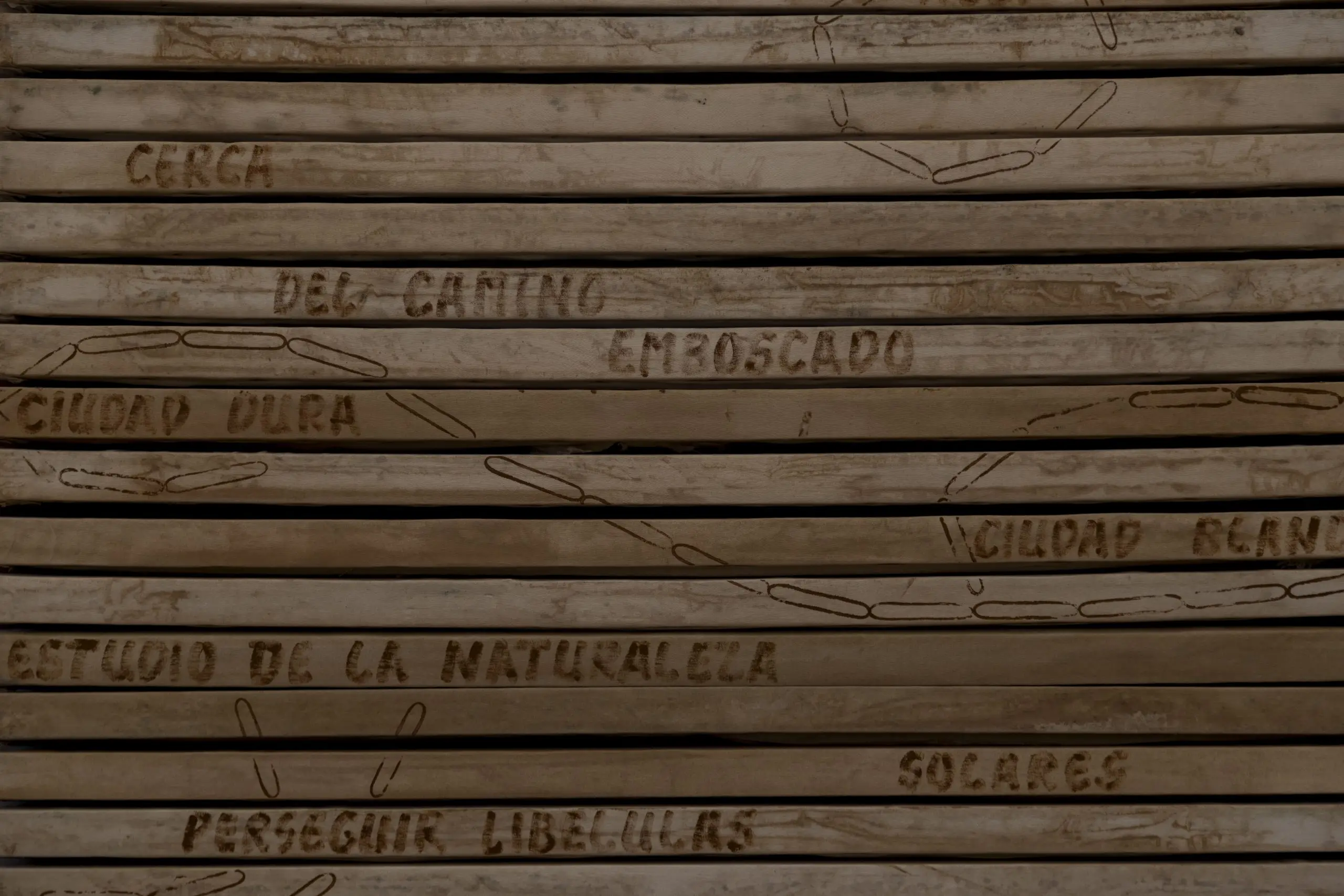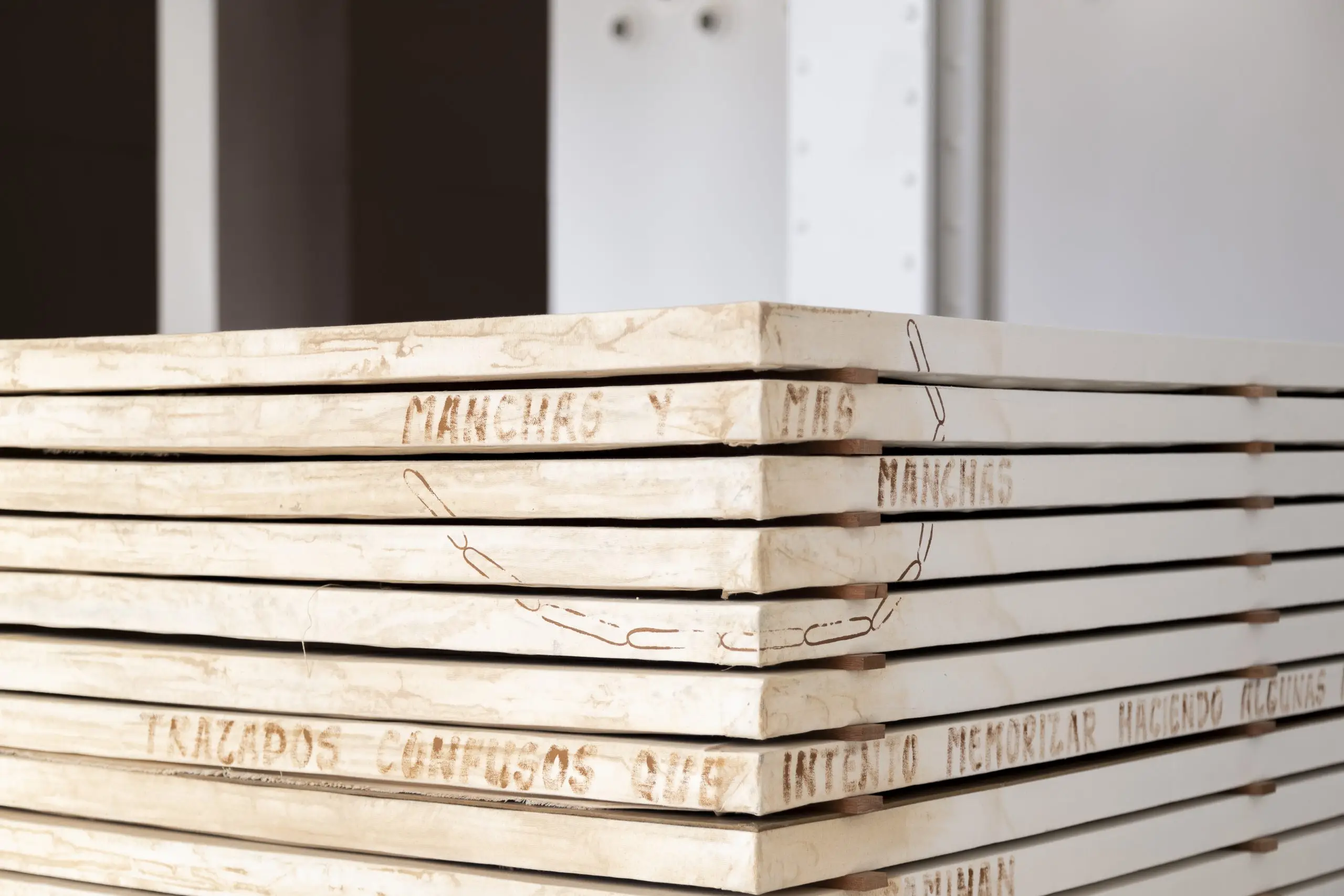 Imaginária é construída a partir da acumulação de vestígios que se repetem e se acumulam para gerar uma nova disposição material. Fuentesal Arenillas guarda, recorta, transporta todas essas memórias do decorrer dos anos partilhados, ficando aderidas a estas placas de táblex que foram o chão das suas oficinas, produzindo um arquivo de formas descontroladas. Um palimpsesto intervencionado pela natureza sem controlo, com um caminho para novas leituras adquiridas a partir de mais de setenta bastidores que dão forma à obra. Cada uma delas documenta formas concretas de presenças e ações daqueles que estiveram lá. Para esta ocasião, convidaram o artista LUCE a incorporar um novo olhar e uma nova leitura, contribuindo para ampliar essas camadas de memória. Um trabalho de rastreamento que comunica, une e narra outras formas de intimidade, tornando o quotidiano um cenário partilhado.