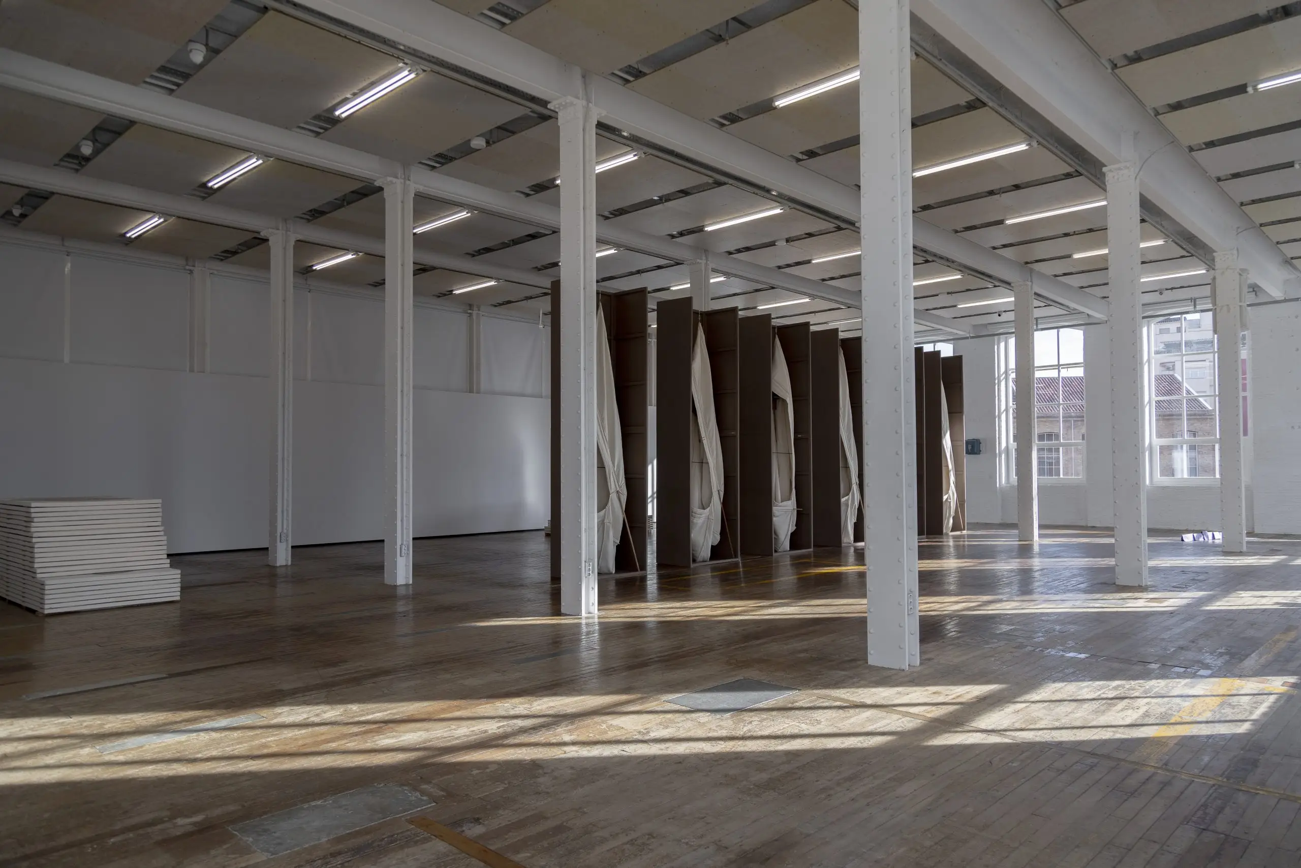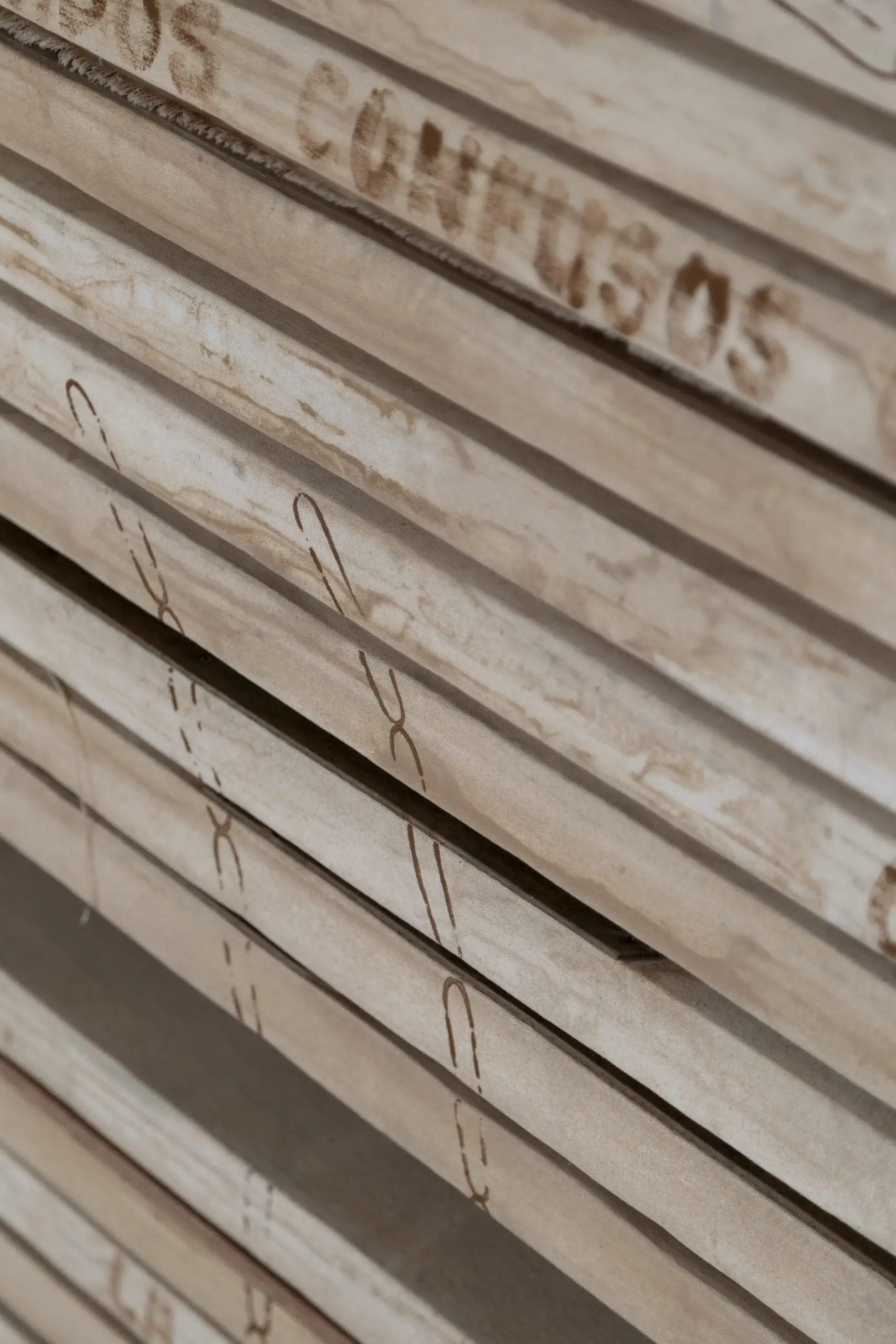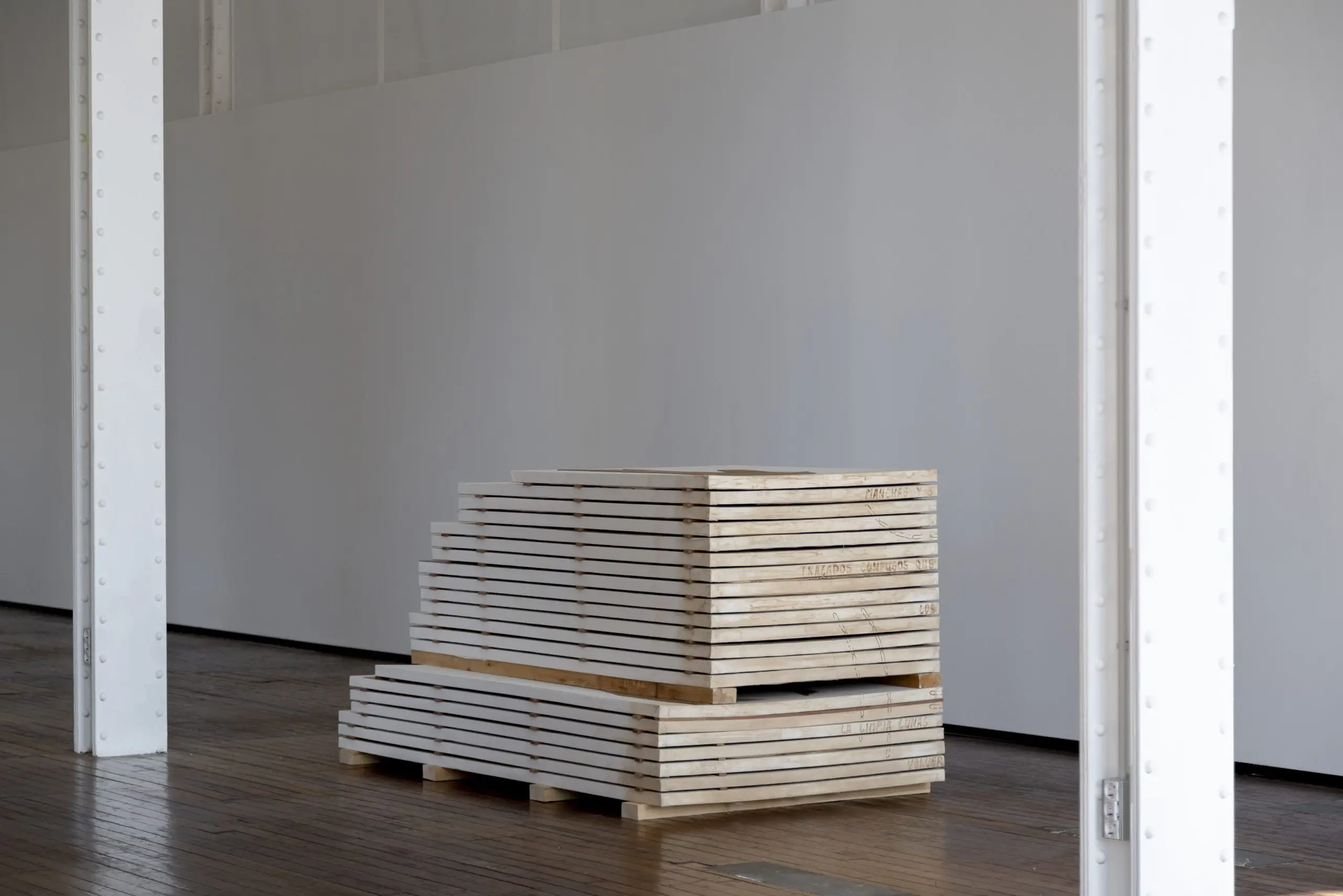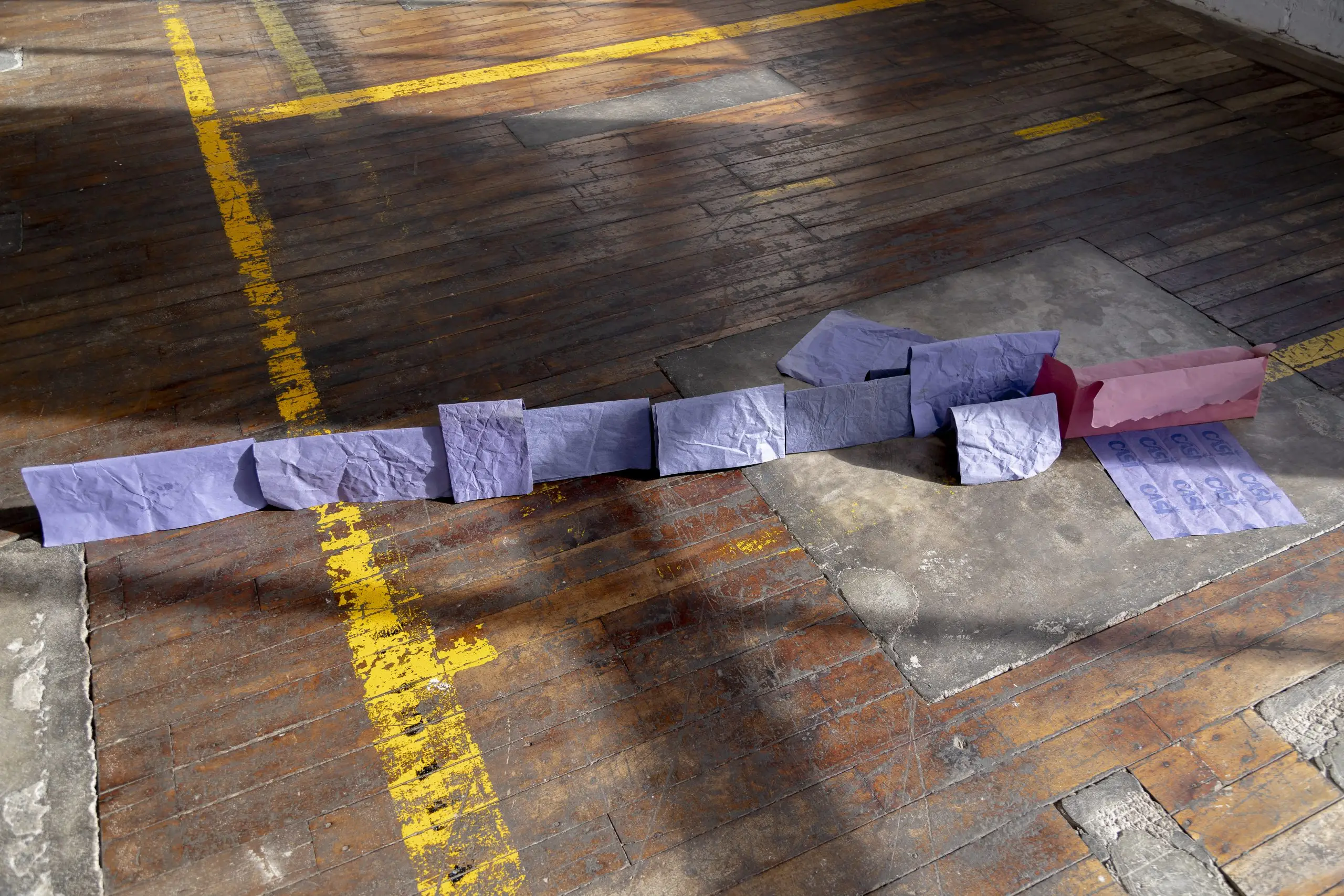 Imaginária é construída a partir da acumulação de vestígios que se repetem e se acumulam para gerar uma nova disposição material. Fuentesal Arenillas guarda, recorta, transporta todas essas memórias do decorrer dos anos partilhados, ficando aderidas a estas placas de táblex que foram o chão das suas oficinas, produzindo um arquivo de formas descontroladas. Um palimpsesto intervencionado pela natureza sem controlo, com um caminho para novas leituras adquiridas a partir de mais de setenta bastidores que dão forma à obra. Cada uma delas documenta formas concretas de presenças e ações daqueles que estiveram lá. Para esta ocasião, convidaram o artista LUCE a incorporar um novo olhar e uma nova leitura, contribuindo para ampliar essas camadas de memória. Um trabalho de rastreamento que comunica, une e narra outras formas de intimidade, tornando o quotidiano um cenário partilhado.