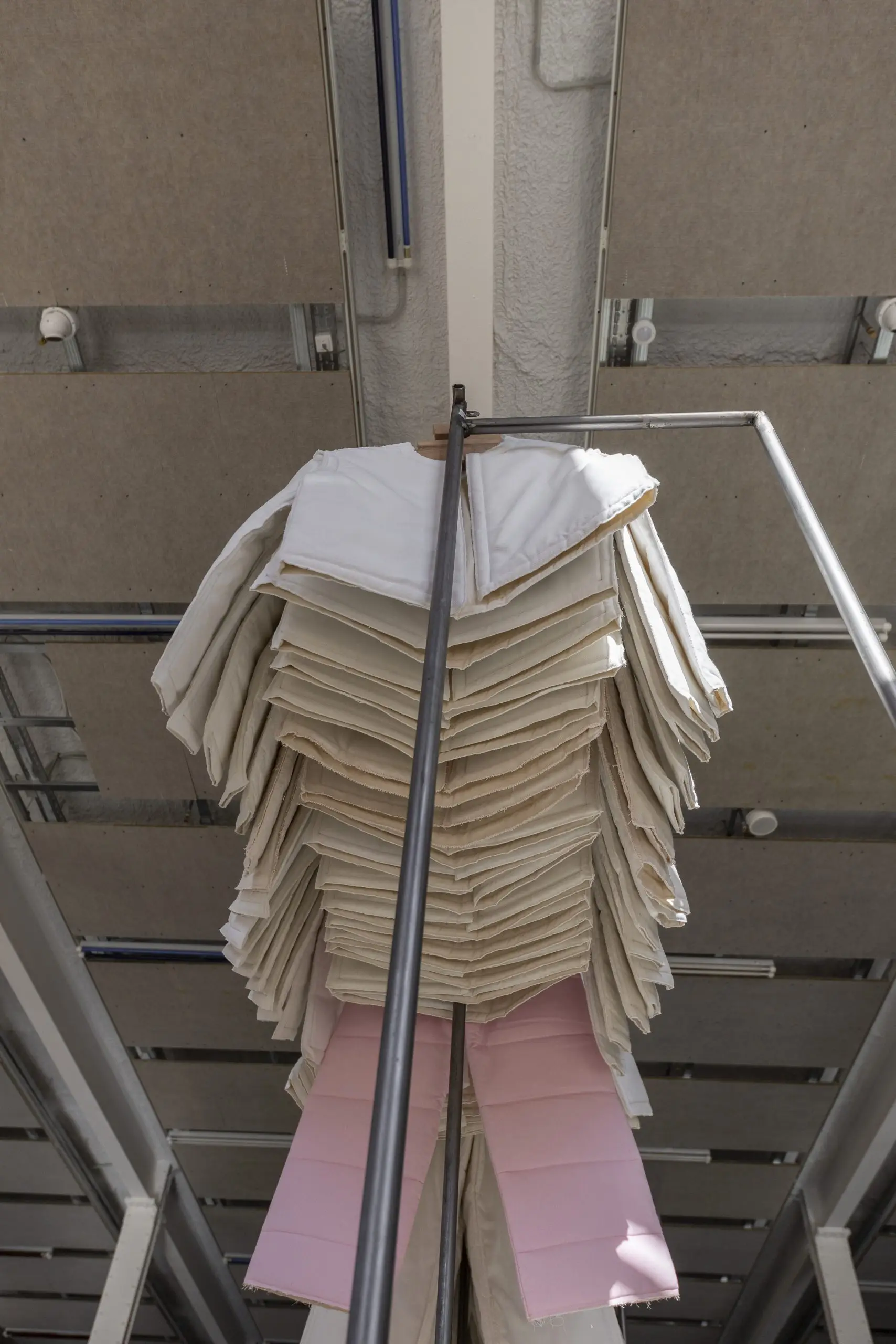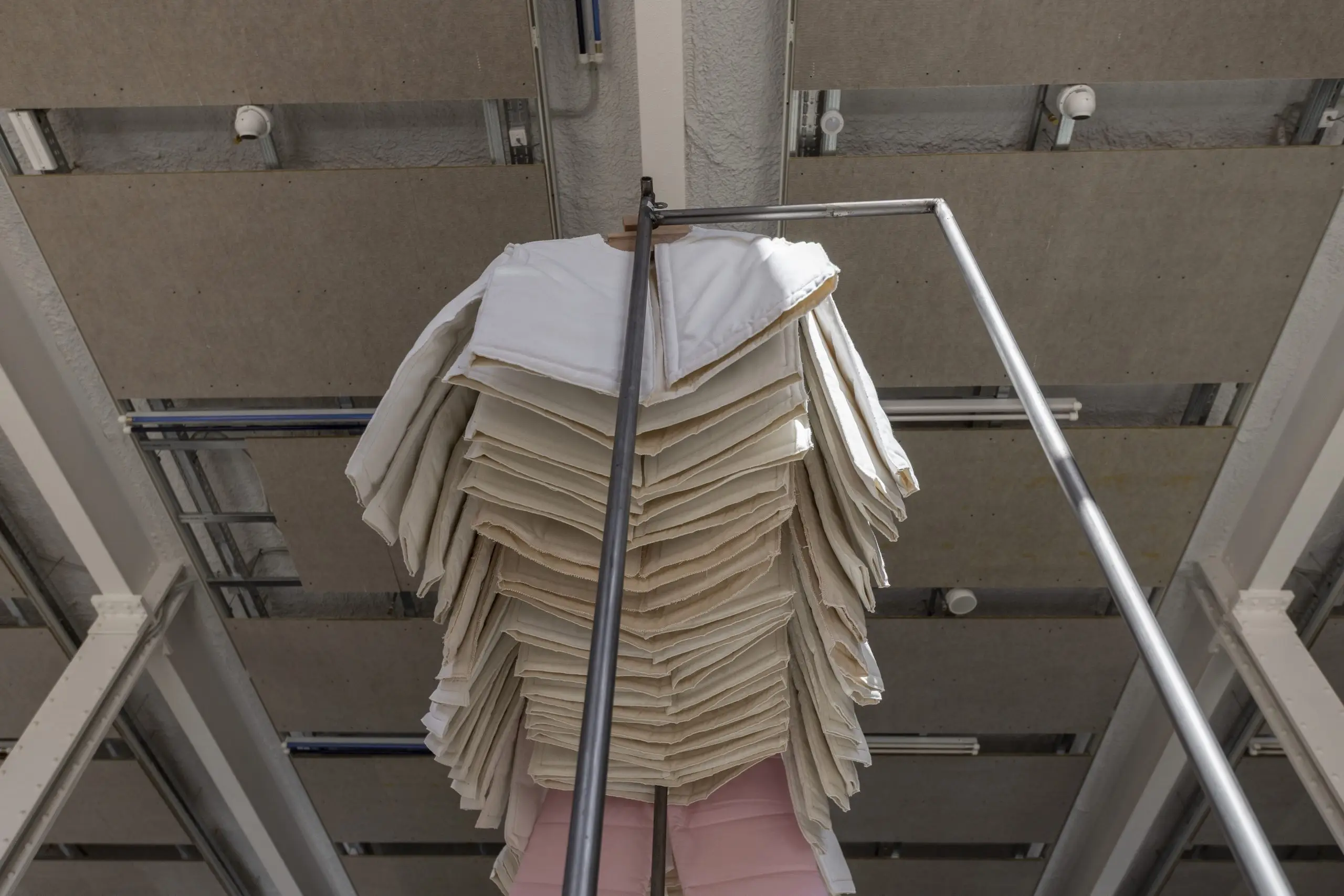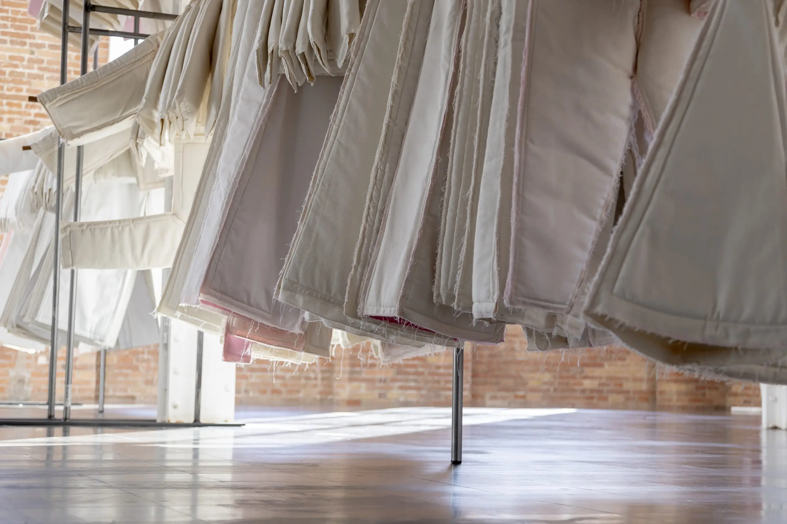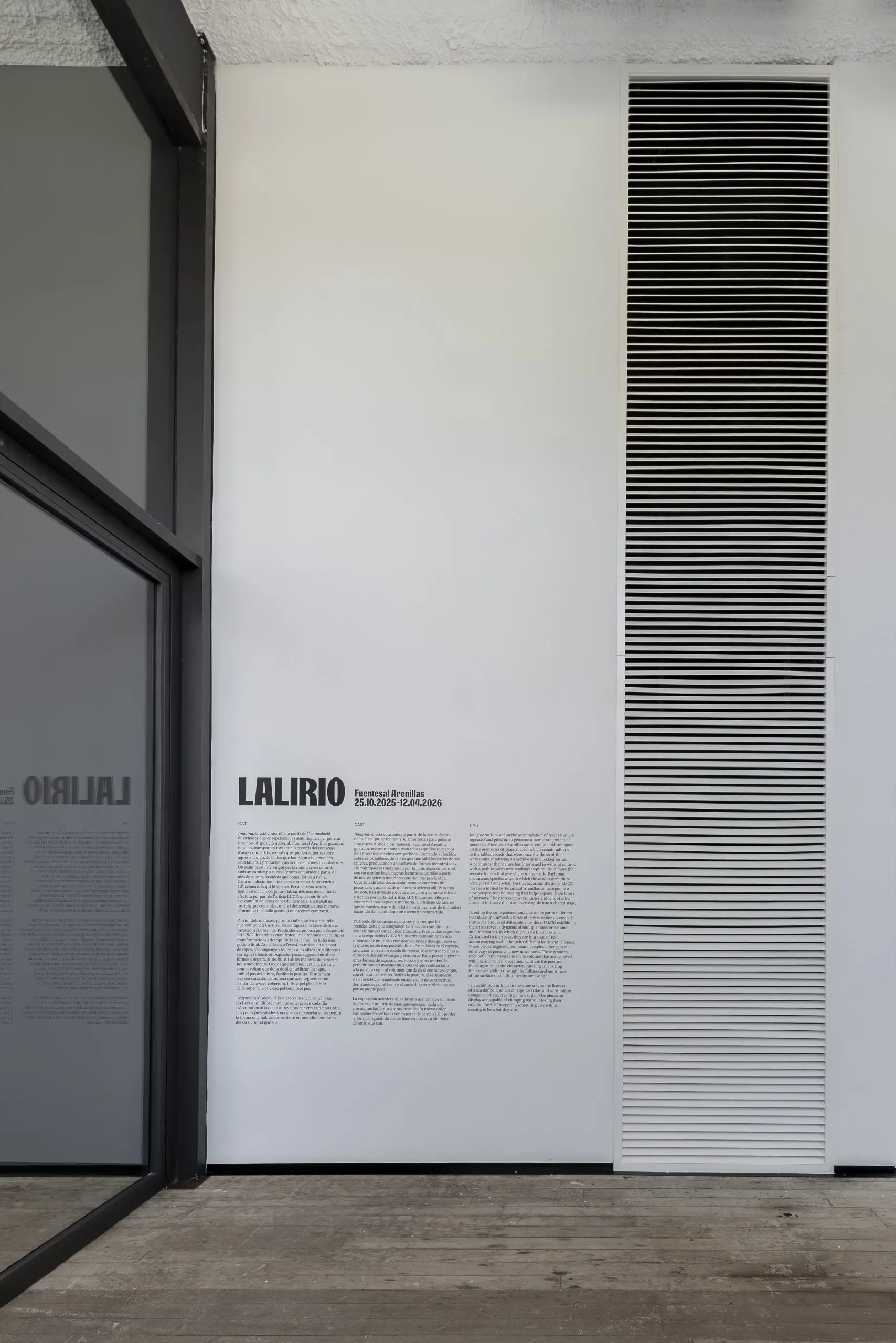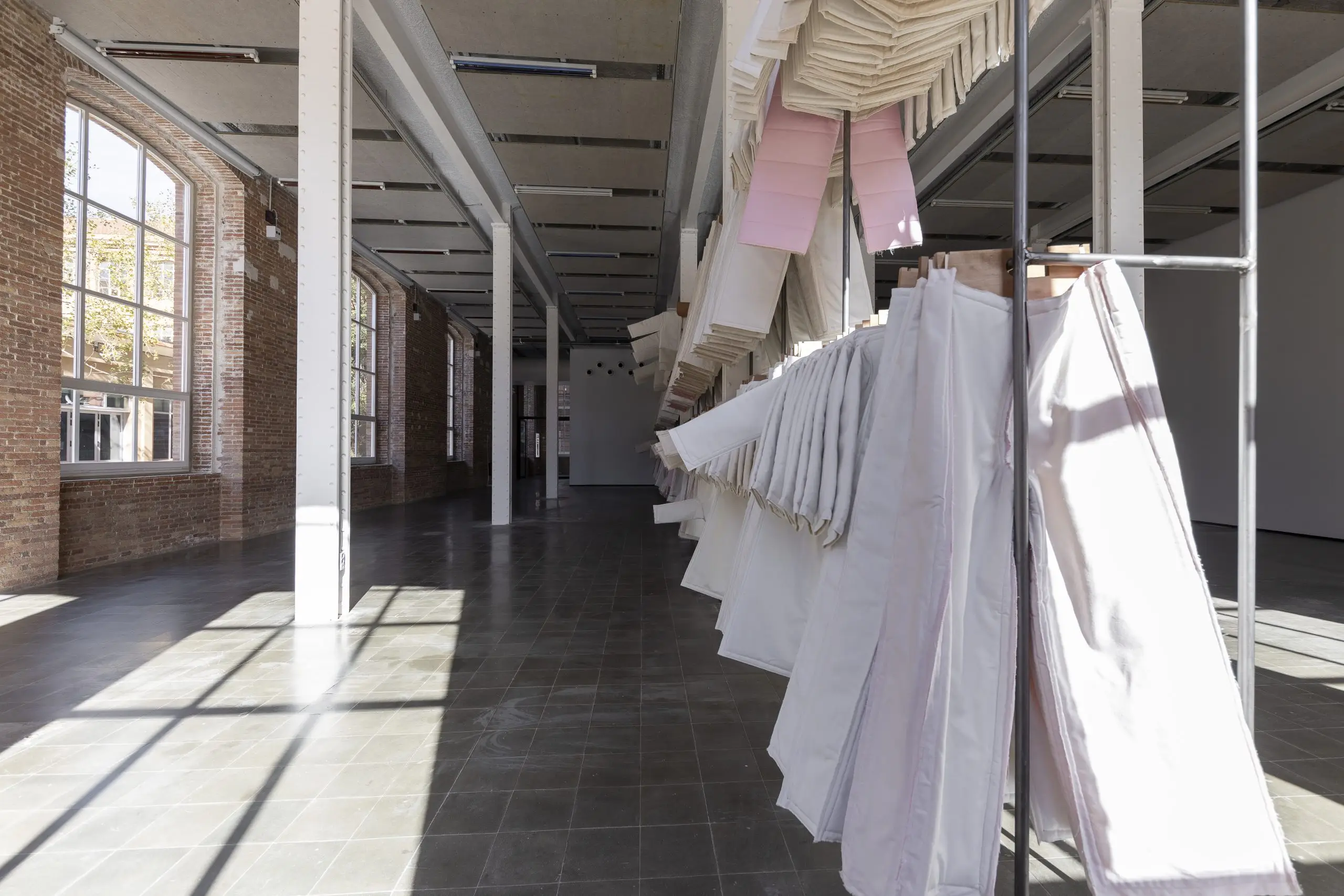 LÁIRIO de Fuentesal Arenillas, com curadoria de Claudia Elies, é uma exposição que se articula em torno de uma acumulação de peças têxteis, dispostas entre pilares e vitrines como uma grande coluna vertebral. O trabalho realizado pelas artistas foi sendo filtrado ao longo de todos estes anos, formando modos de entender a prática escultórica como uma aprendizagem coletiva adaptada a uma perda constante da forma.