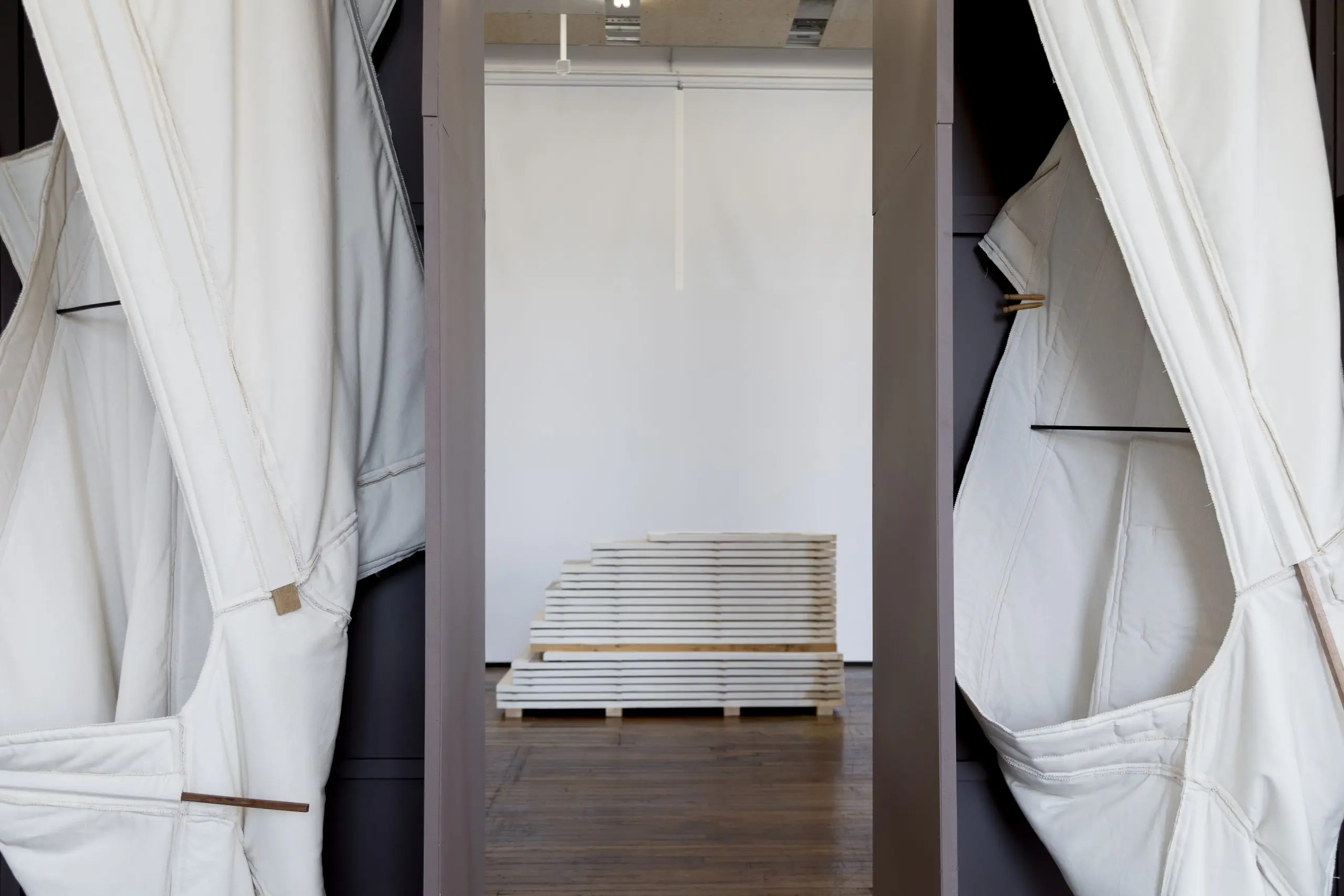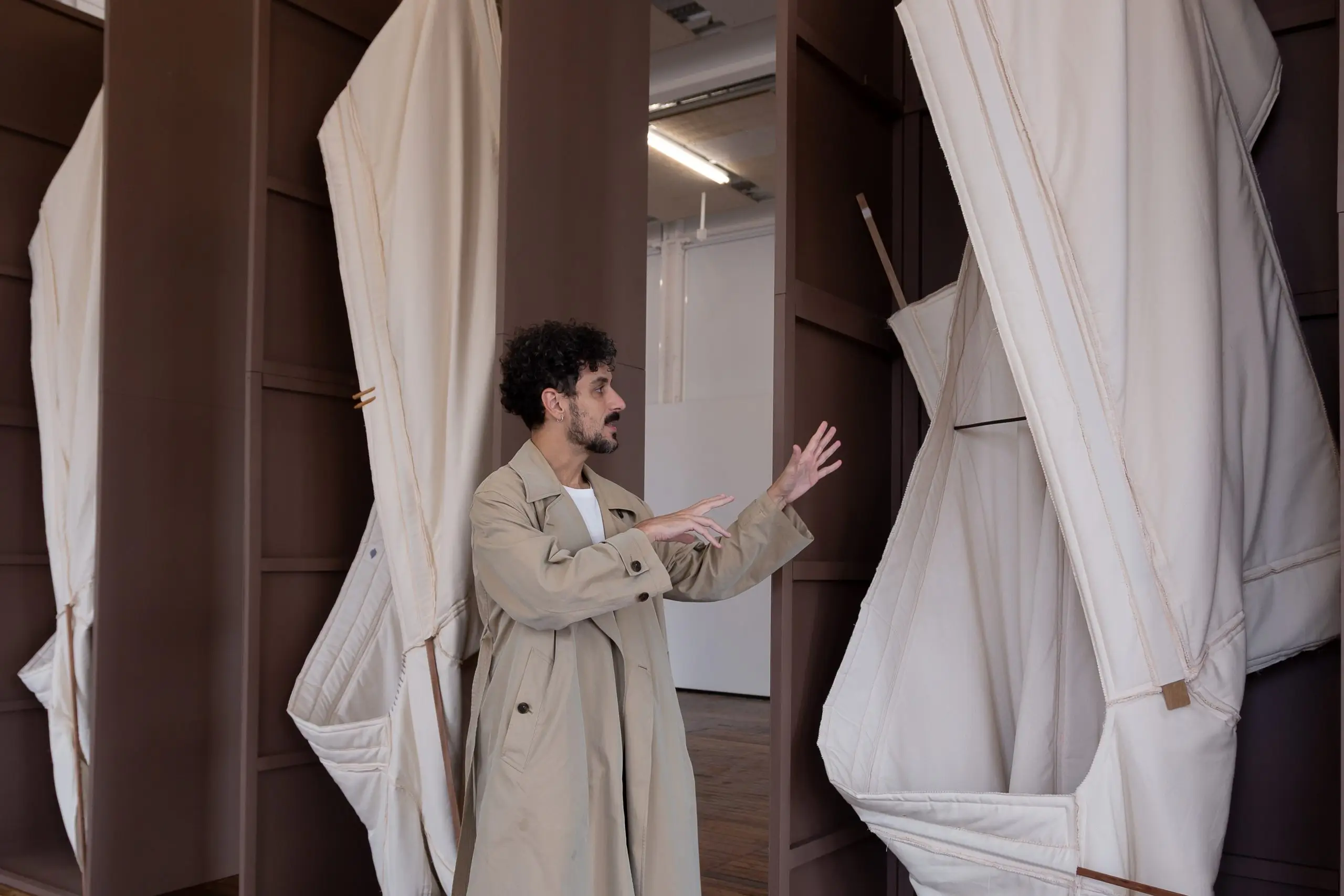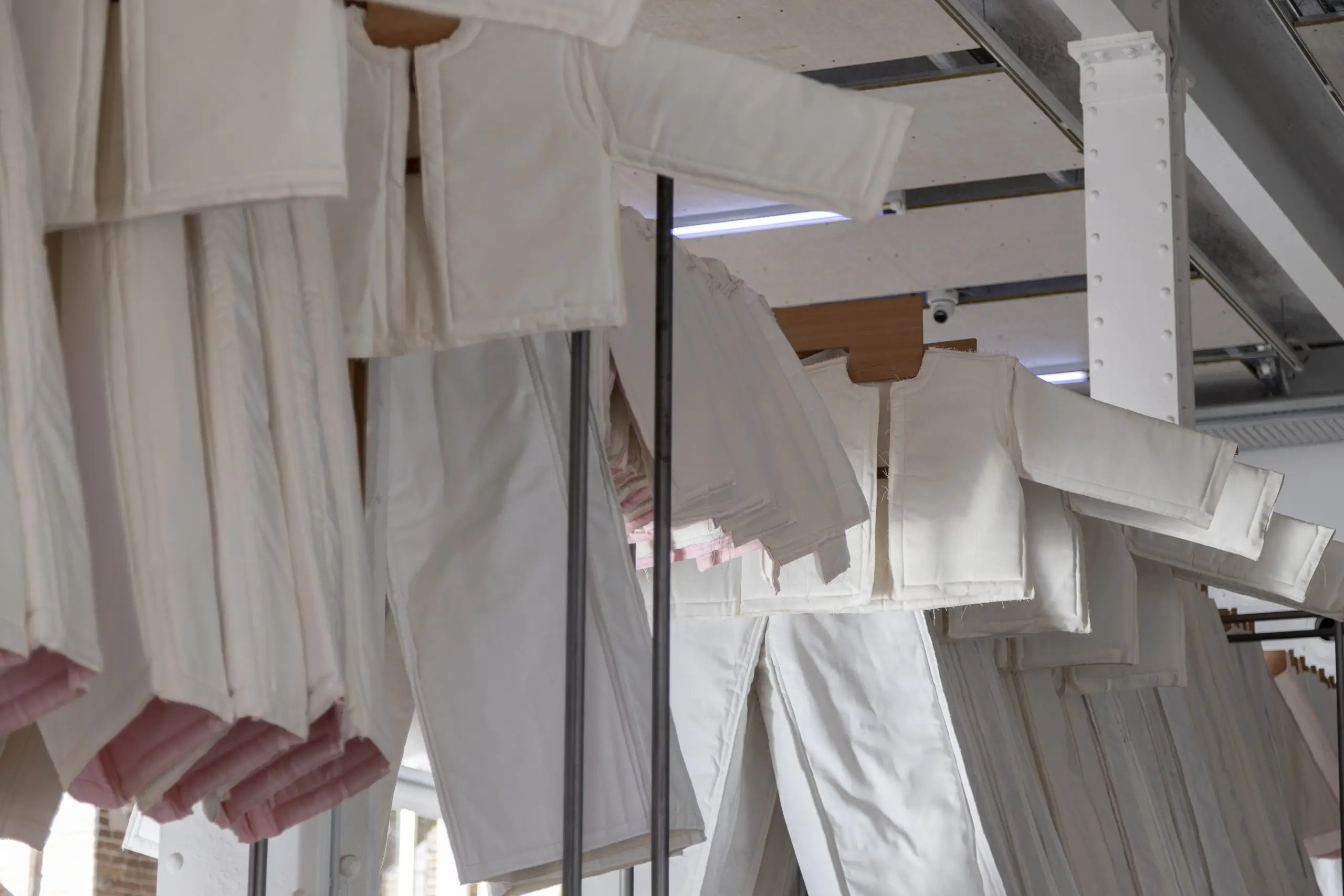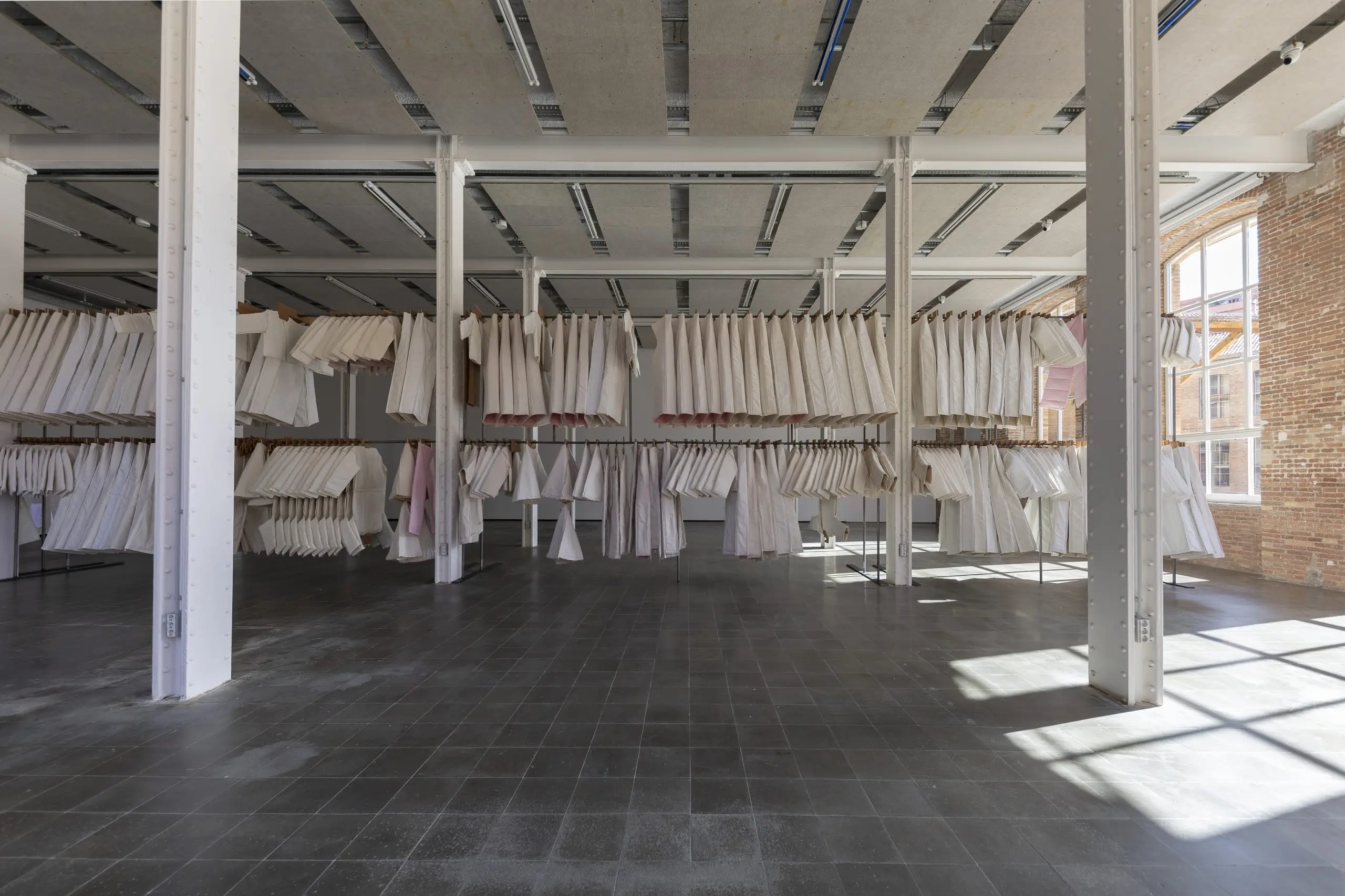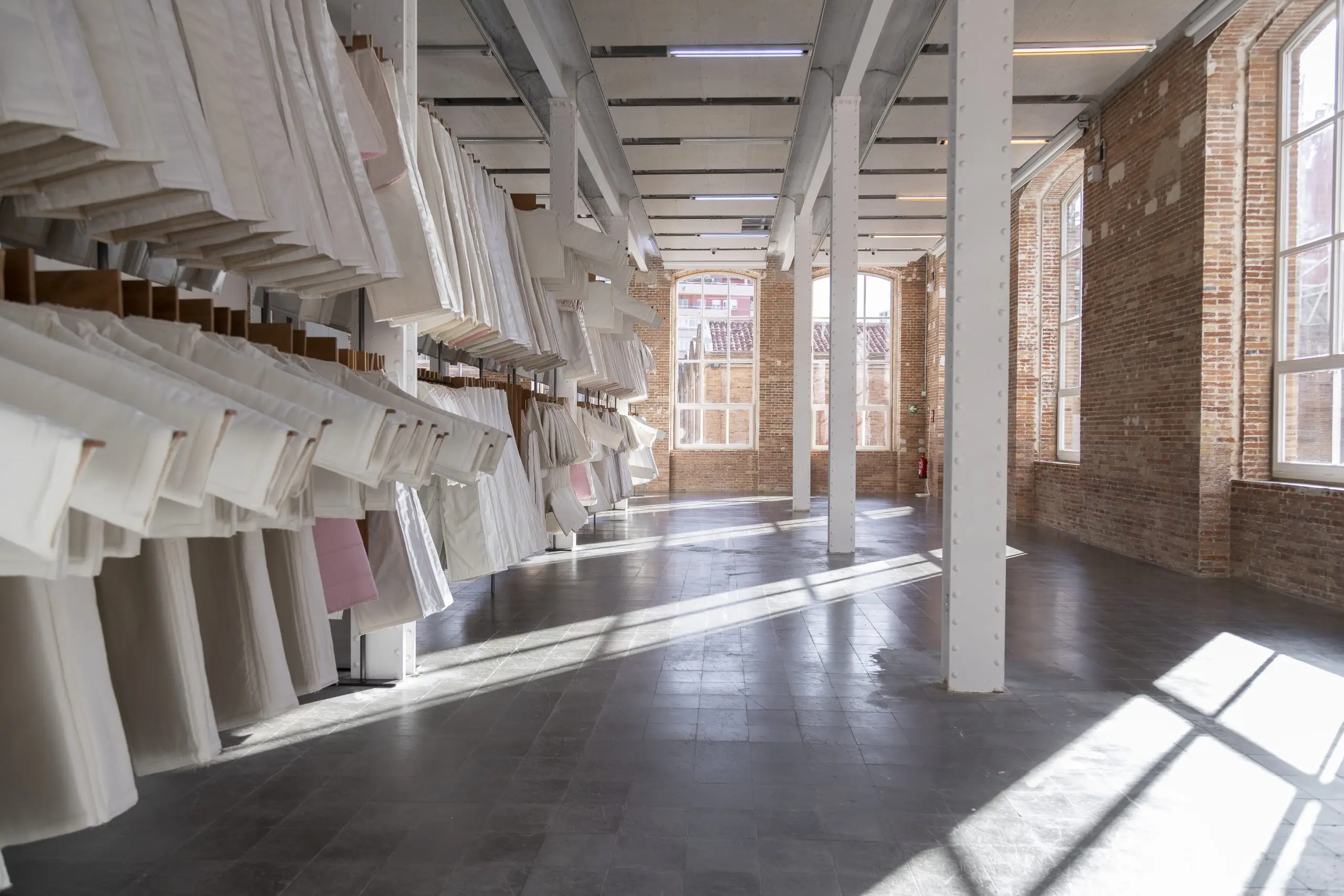 LÁIRIO de Fuentesal Arenillas, com curadoria de Claudia Elies, é uma exposição que se articula em torno de uma acumulação de peças têxteis, dispostas entre pilares e vitrines como uma grande coluna vertebral. O trabalho realizado pelas artistas foi sendo filtrado ao longo de todos estes anos, formando modos de entender a prática escultórica como uma aprendizagem coletiva adaptada a uma perda constante da forma.