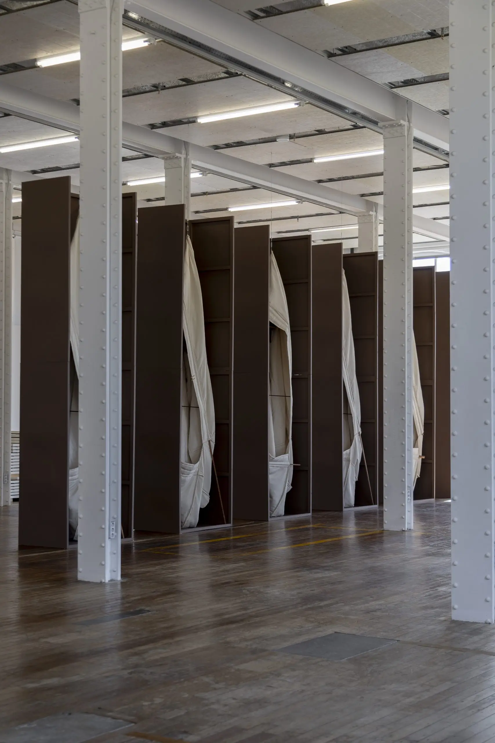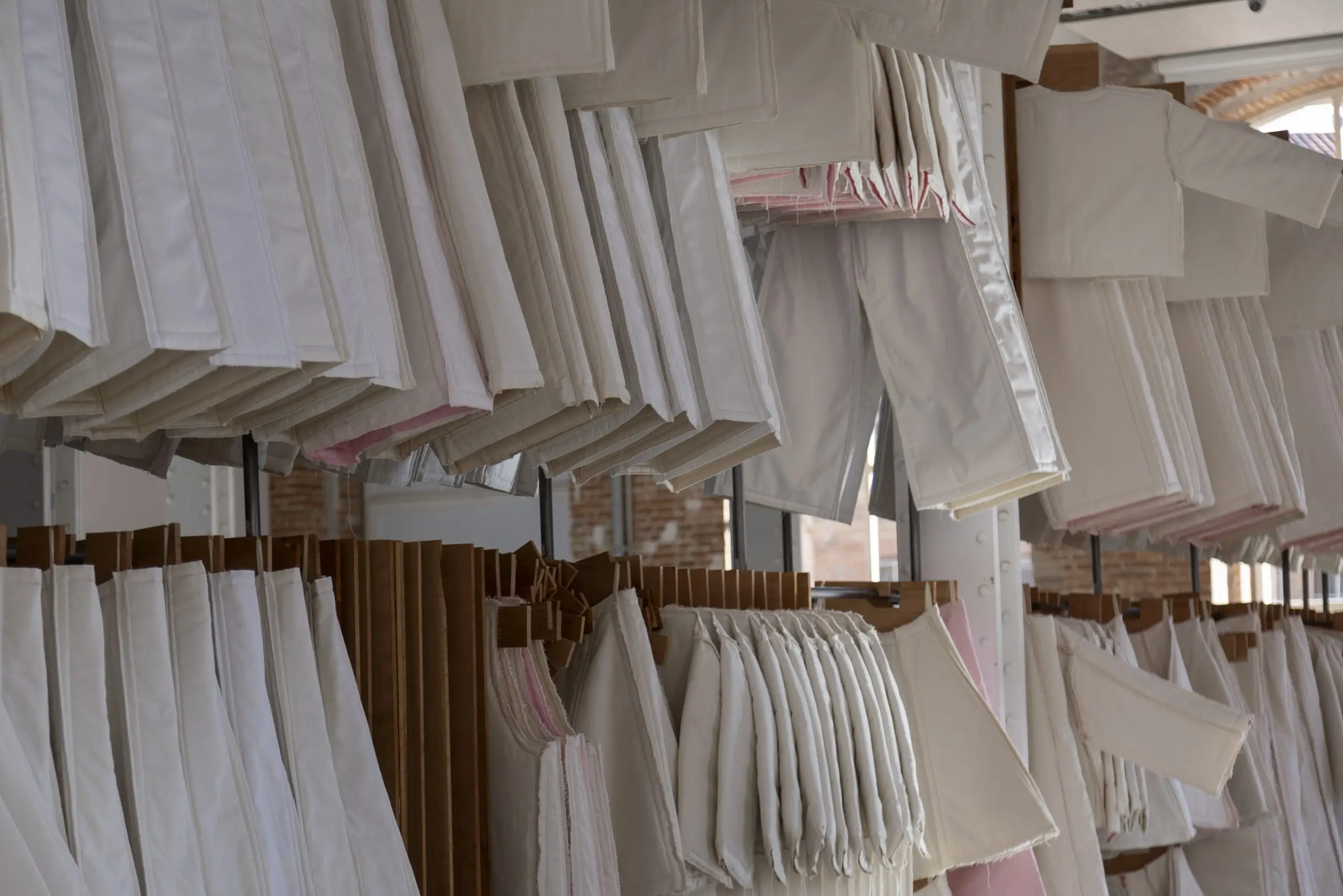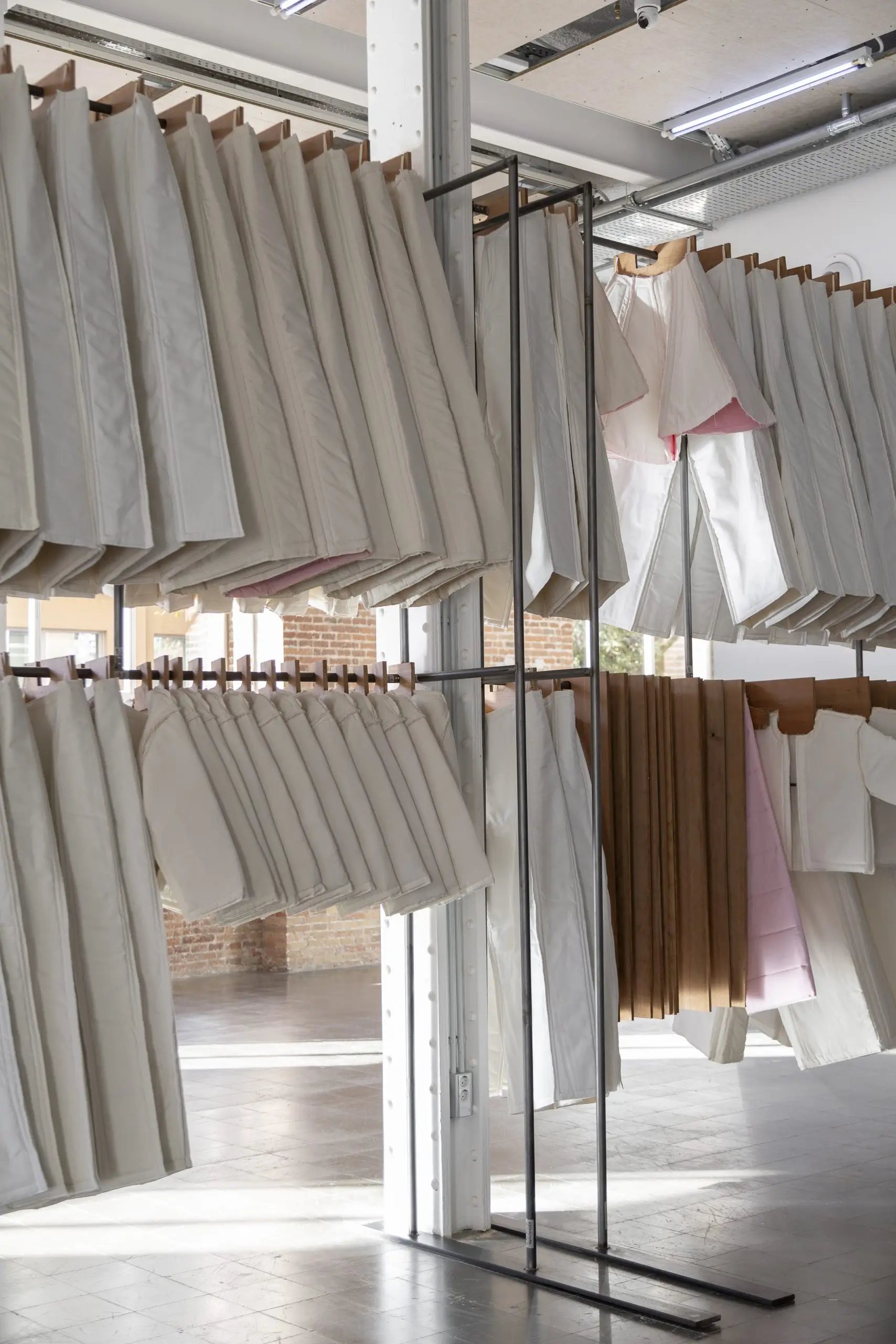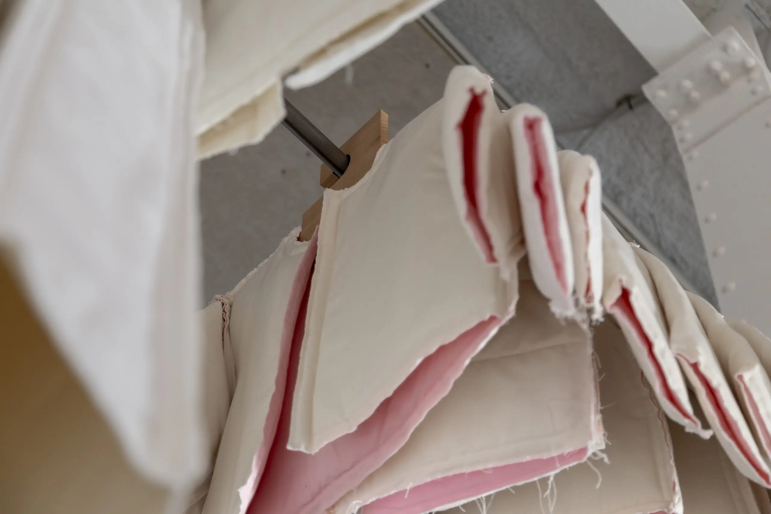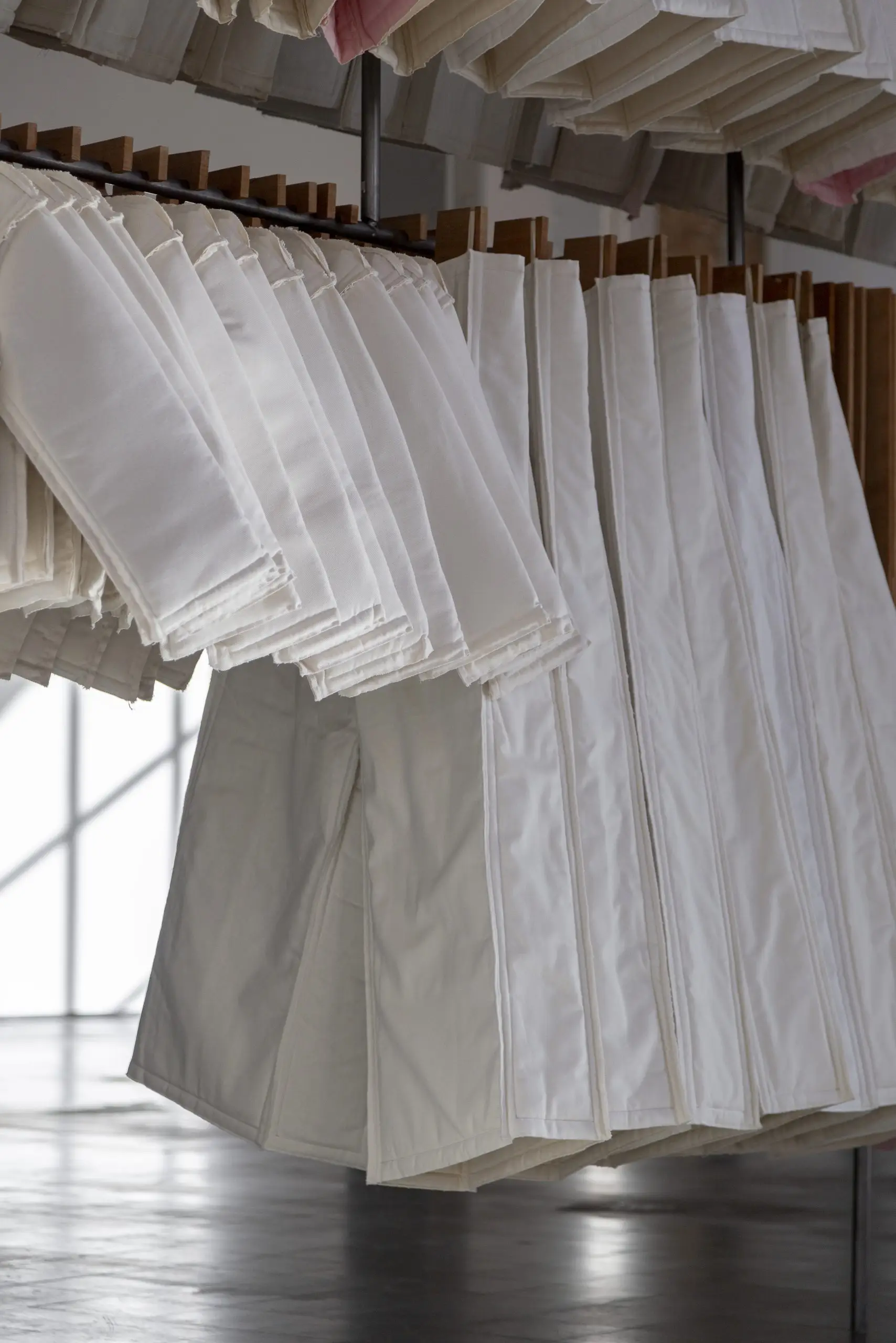 LÁIRIO de Fuentesal Arenillas, com curadoria de Claudia Elies, é uma exposição que se articula em torno de uma acumulação de peças têxteis, dispostas entre pilares e vitrines como uma grande coluna vertebral. O trabalho realizado pelas artistas foi sendo filtrado ao longo de todos estes anos, formando modos de entender a prática escultórica como uma aprendizagem coletiva adaptada a uma perda constante da forma.