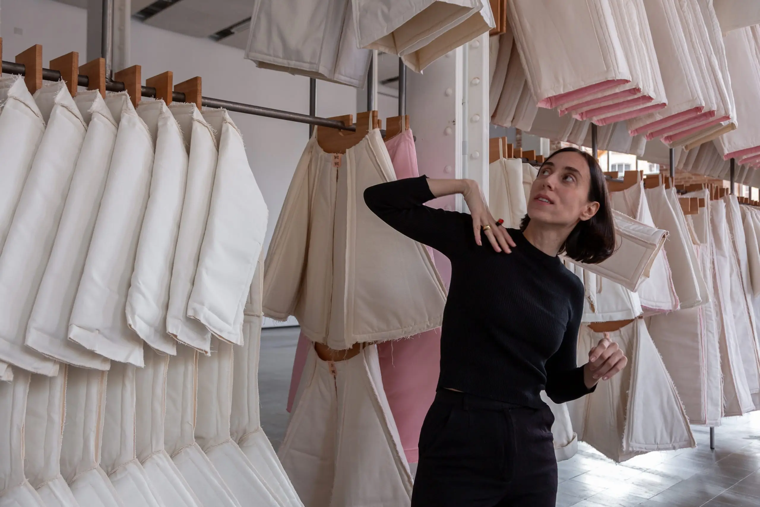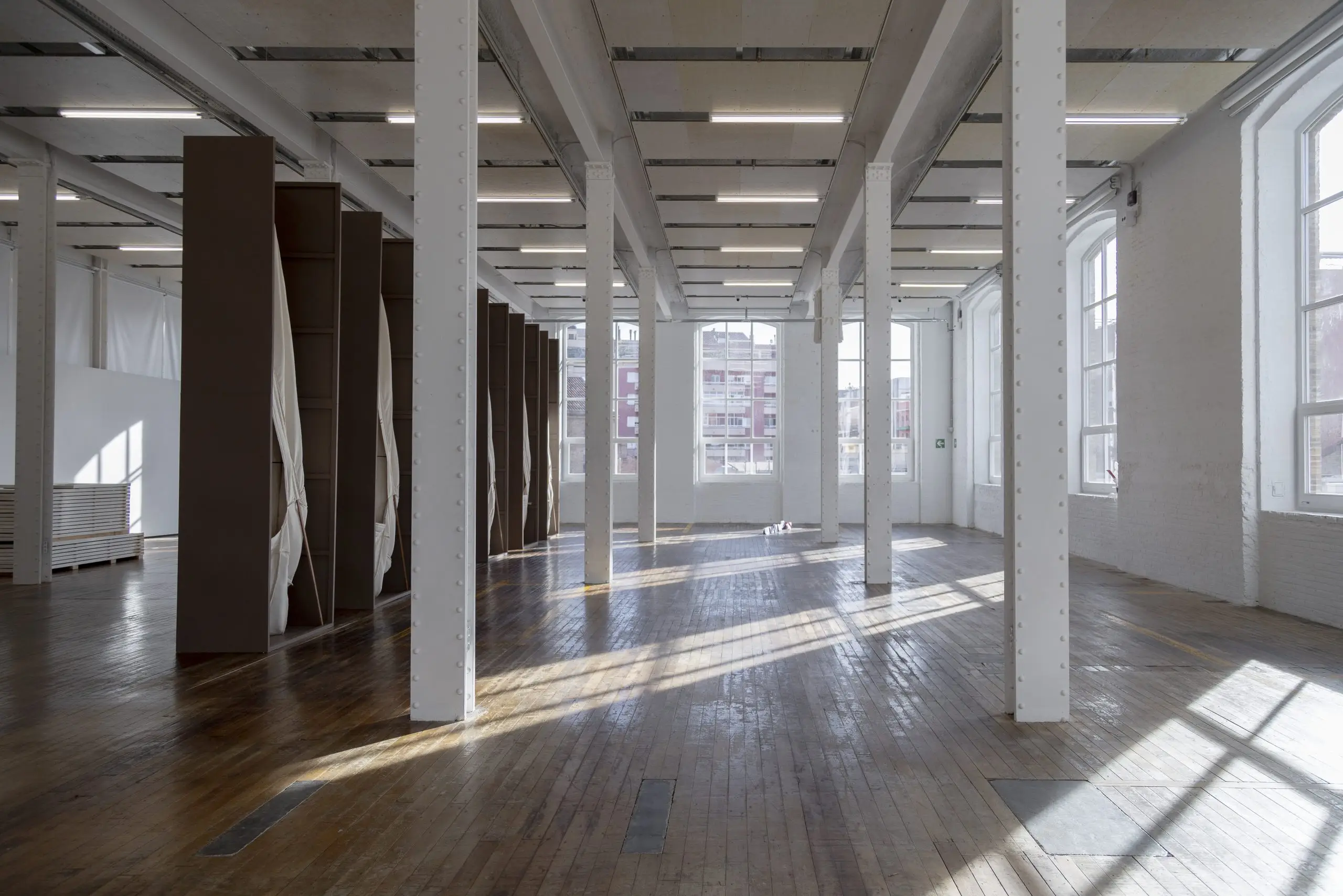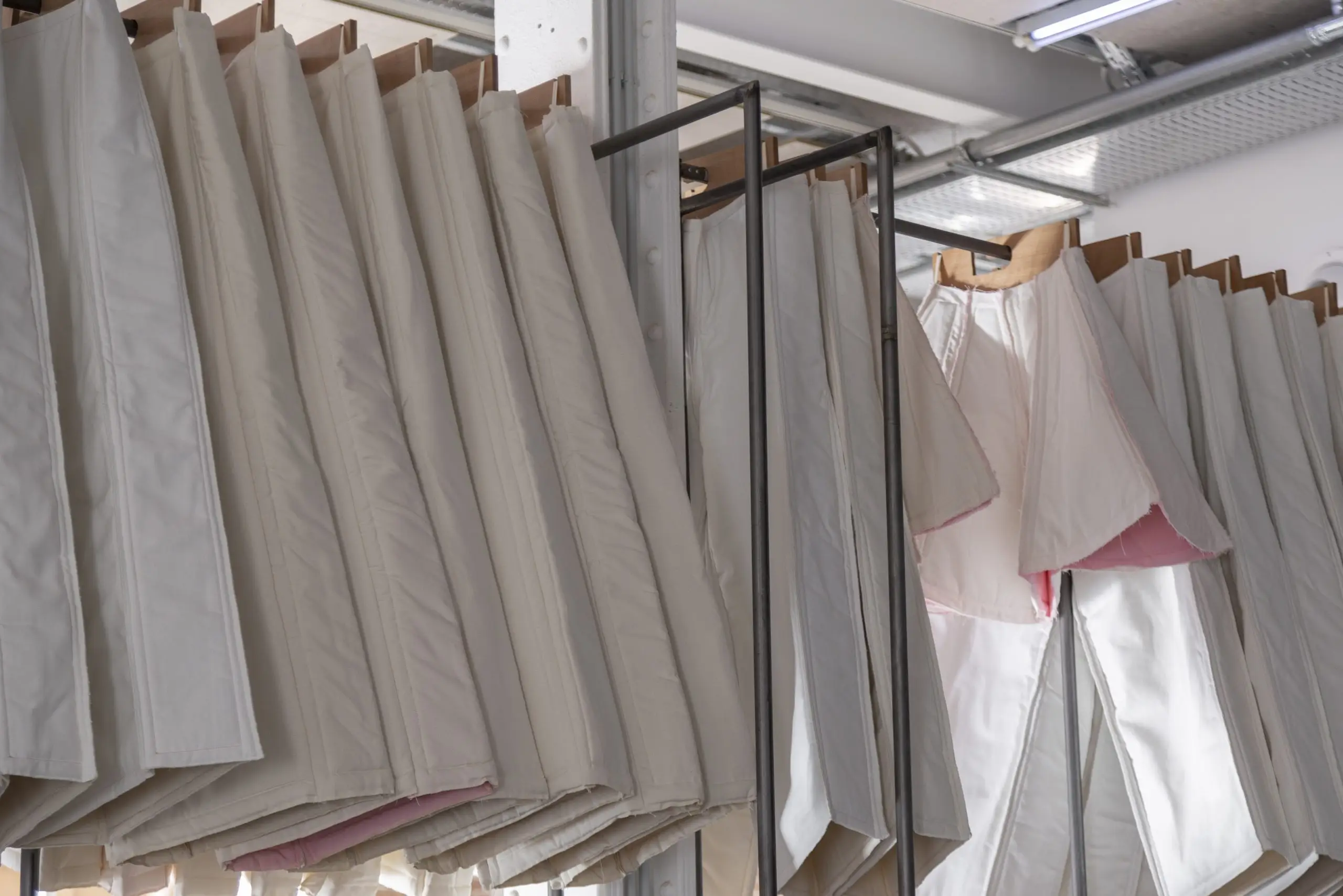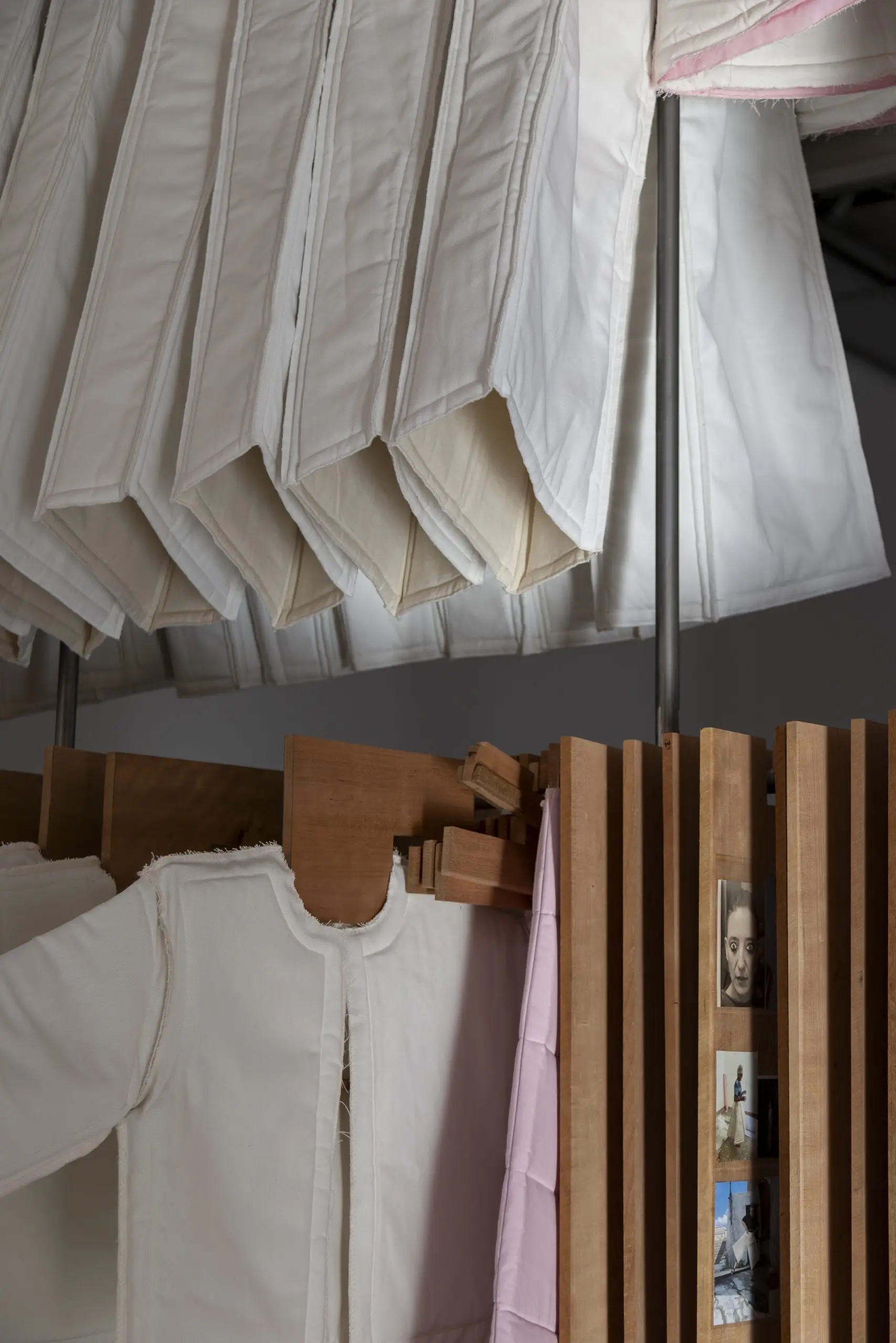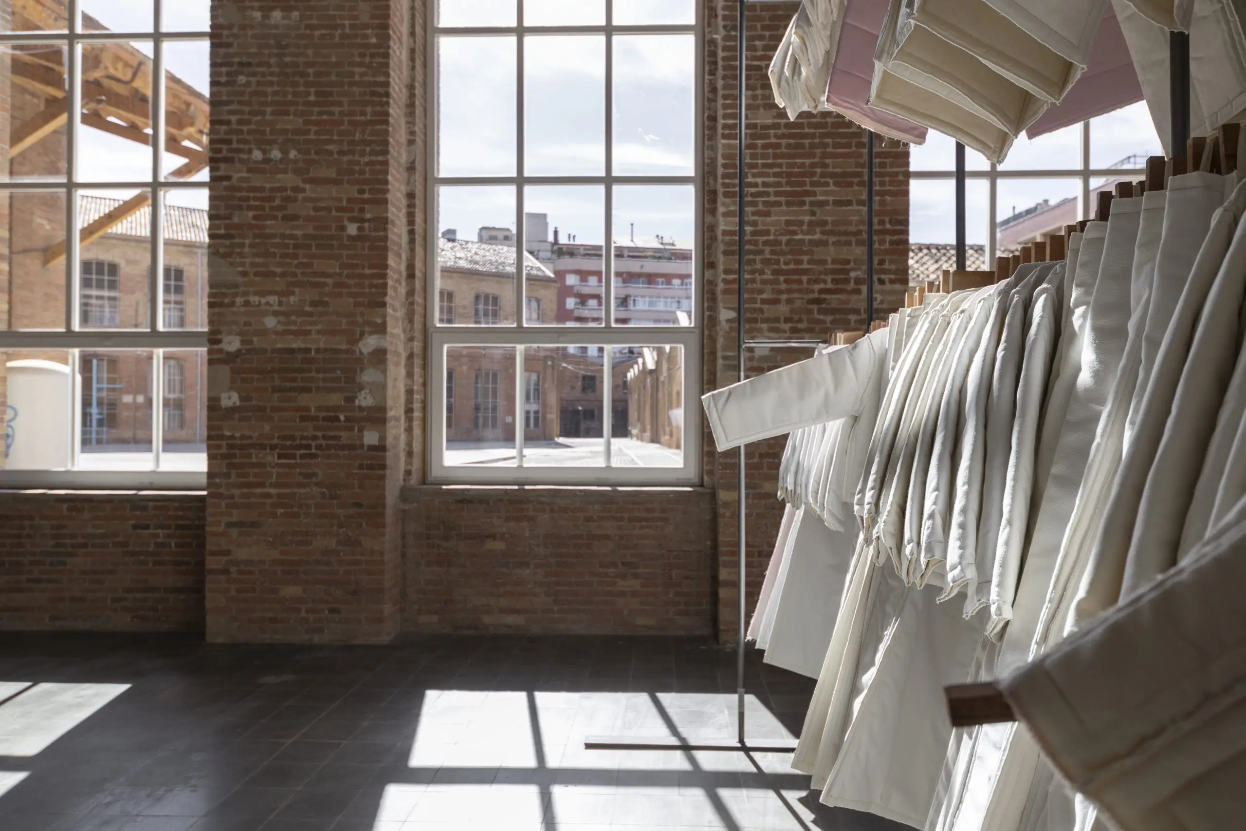 LÁIRIO de Fuentesal Arenillas, com curadoria de Claudia Elies, é uma exposição que se articula em torno de uma acumulação de peças têxteis, dispostas entre pilares e vitrines como uma grande coluna vertebral. O trabalho realizado pelas artistas foi sendo filtrado ao longo de todos estes anos, formando modos de entender a prática escultórica como uma aprendizagem coletiva adaptada a uma perda constante da forma.
