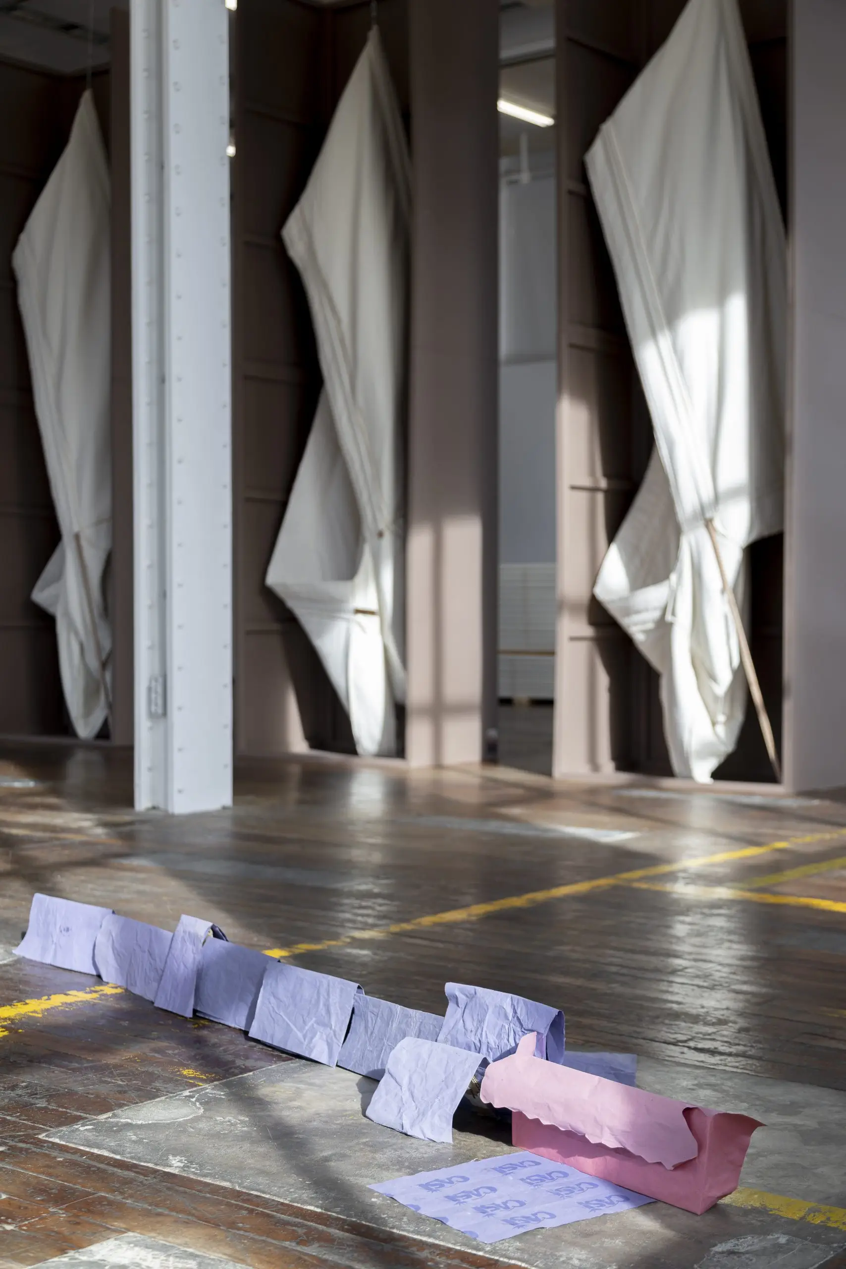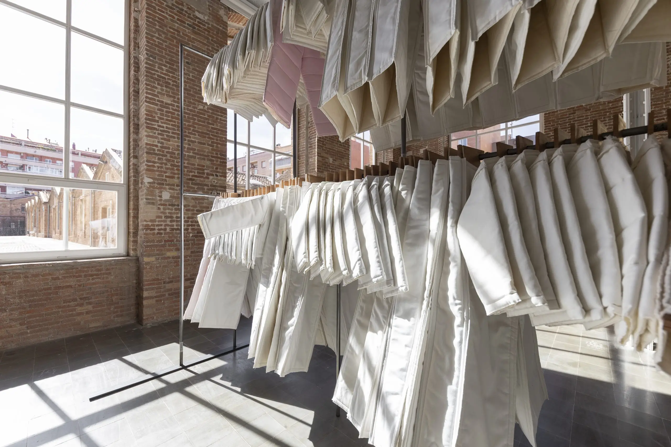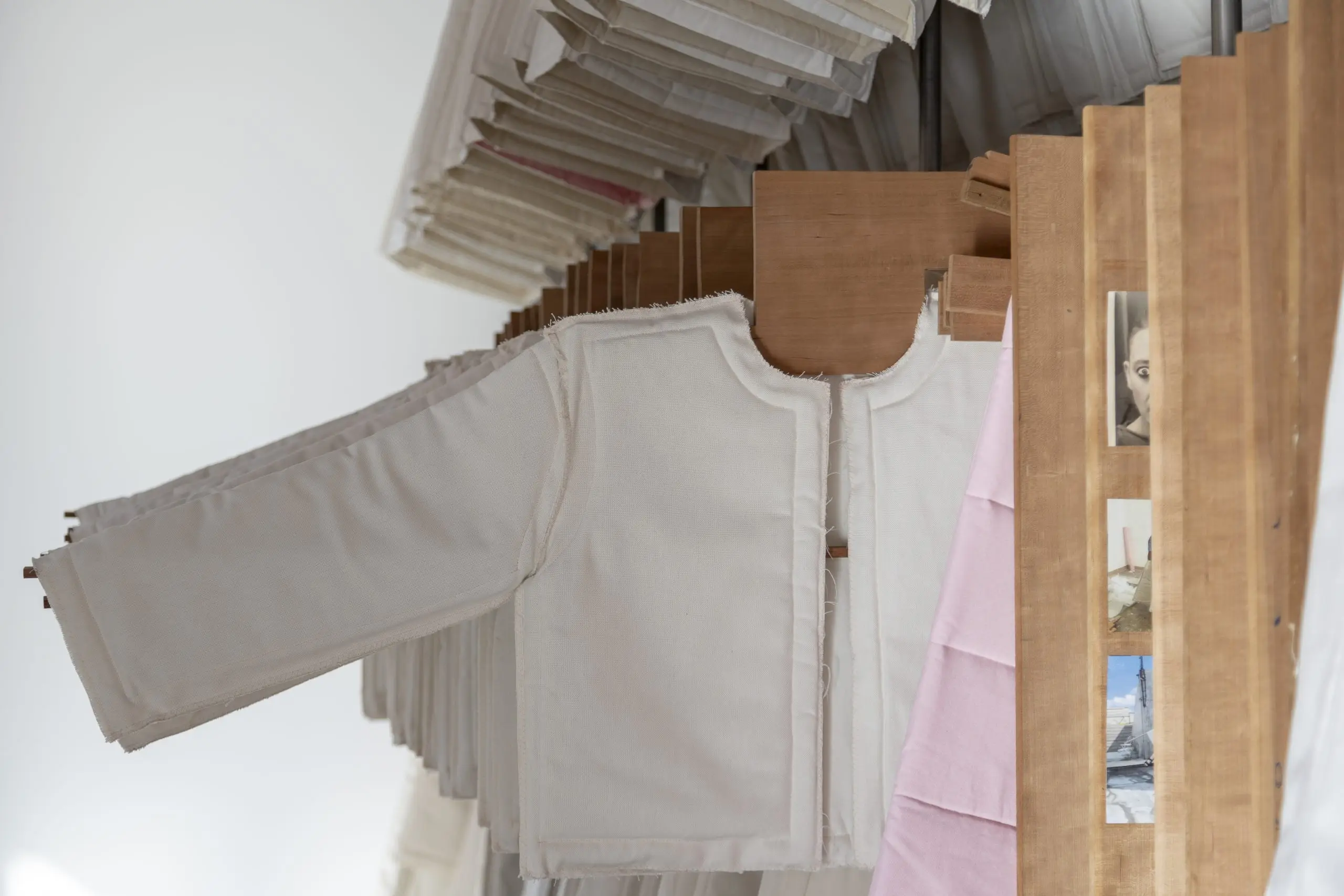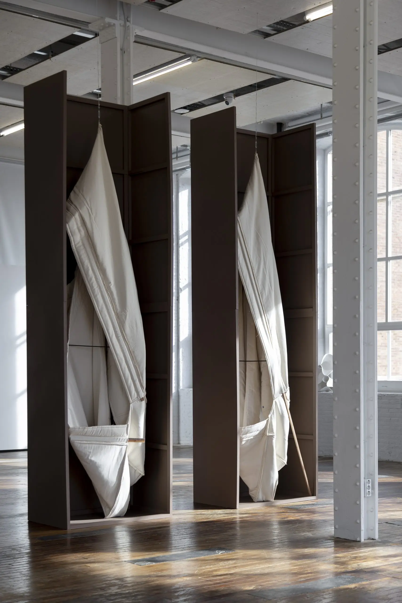 LÁIRIO de Fuentesal Arenillas, com curadoria de Claudia Elies, é uma exposição que se articula em torno de uma acumulação de peças têxteis, dispostas entre pilares e vitrines como uma grande coluna vertebral. O trabalho realizado pelas artistas foi sendo filtrado ao longo de todos estes anos, formando modos de entender a prática escultórica como uma aprendizagem coletiva adaptada a uma perda constante da forma.