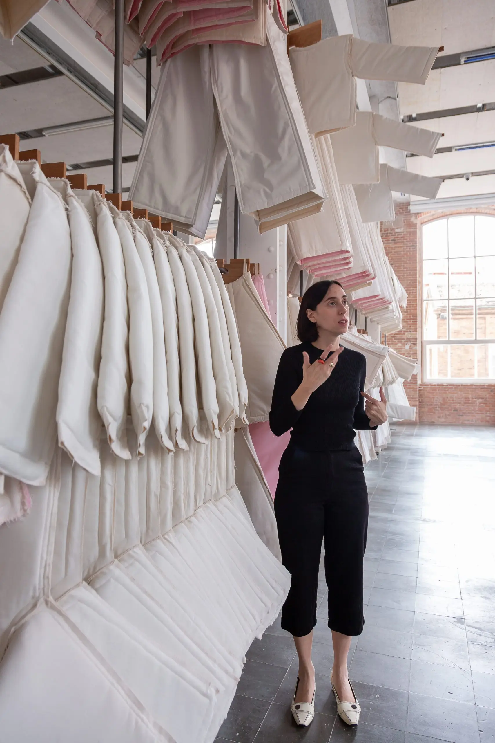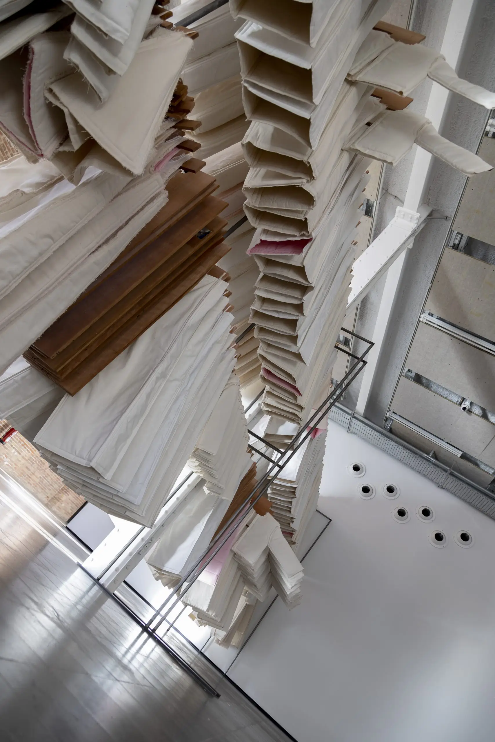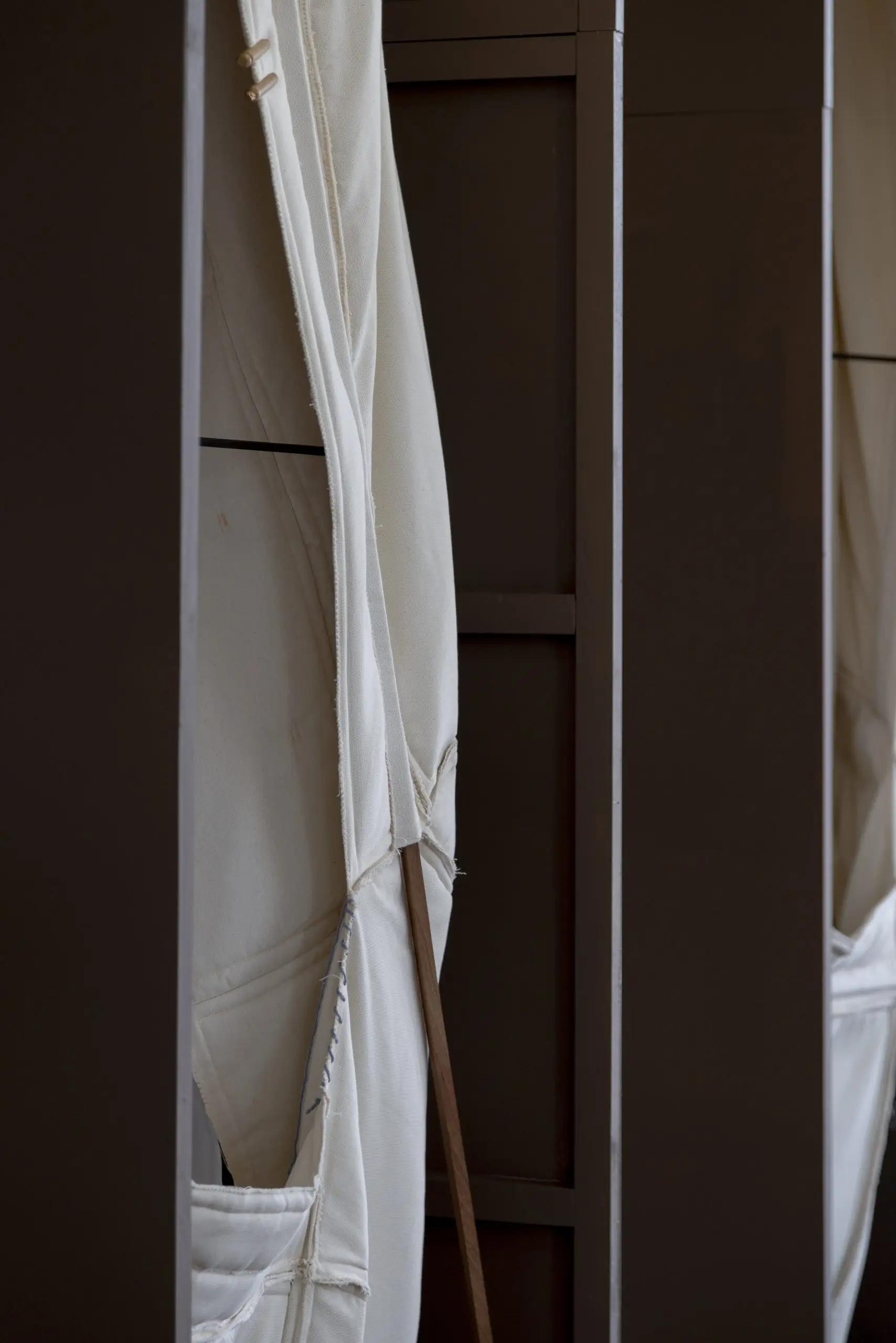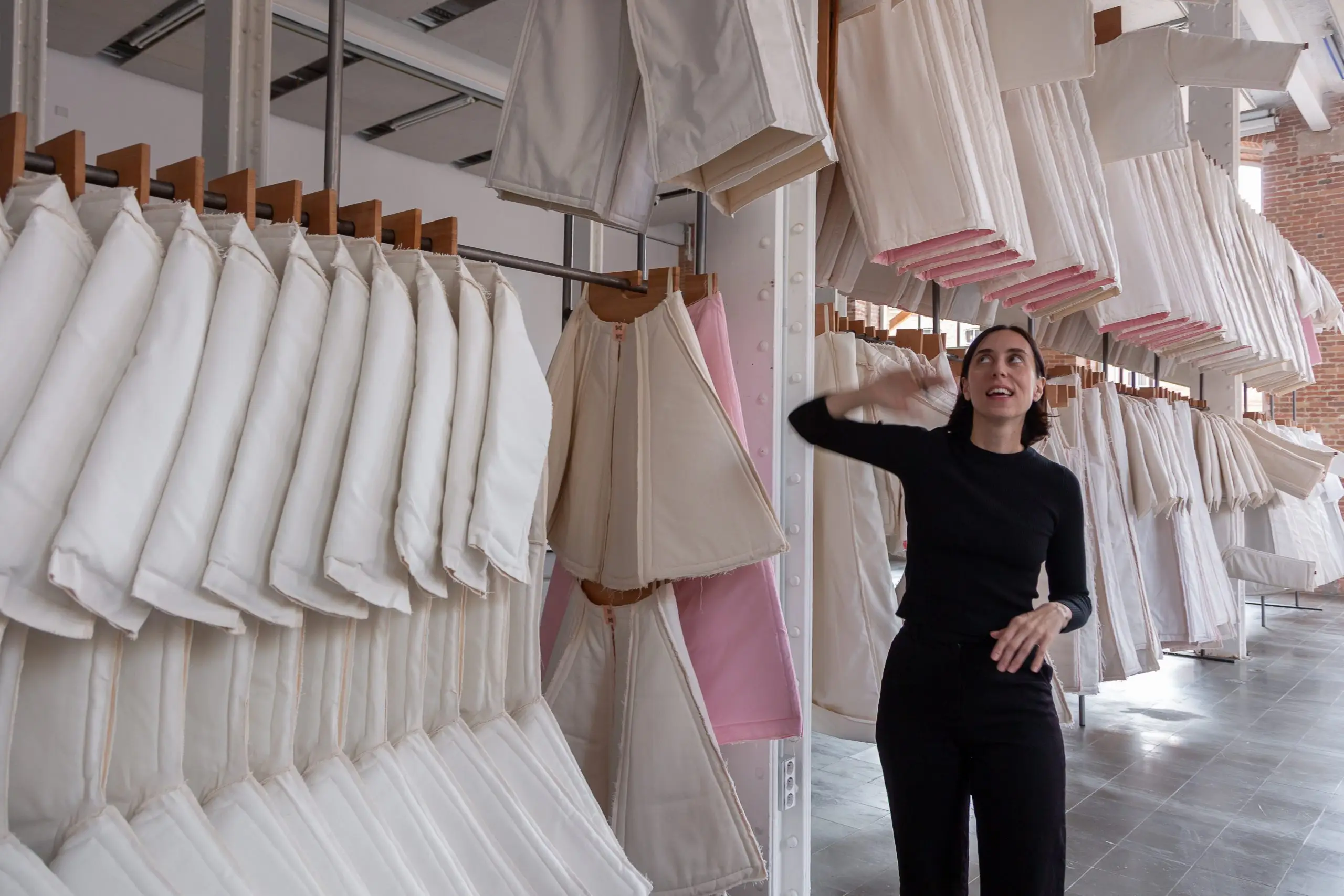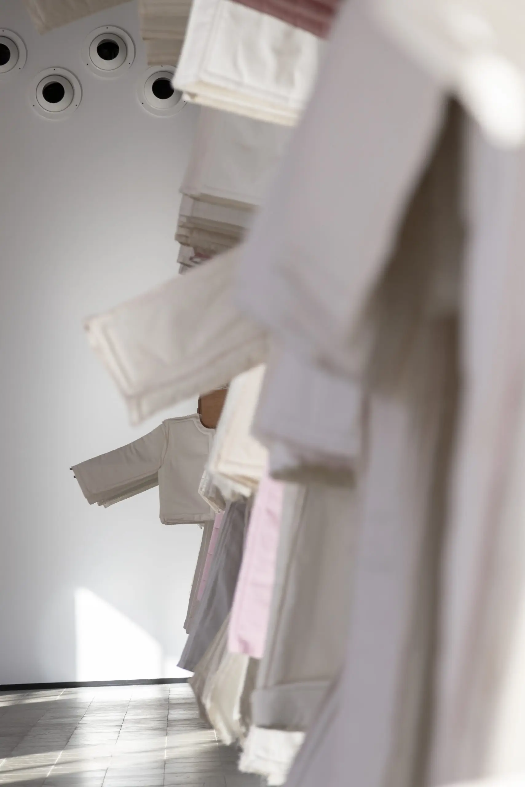 LÁIRIO de Fuentesal Arenillas, com curadoria de Claudia Elies, é uma exposição que se articula em torno de uma acumulação de peças têxteis, dispostas entre pilares e vitrines como uma grande coluna vertebral. O trabalho realizado pelas artistas foi sendo filtrado ao longo de todos estes anos, formando modos de entender a prática escultórica como uma aprendizagem coletiva adaptada a uma perda constante da forma.