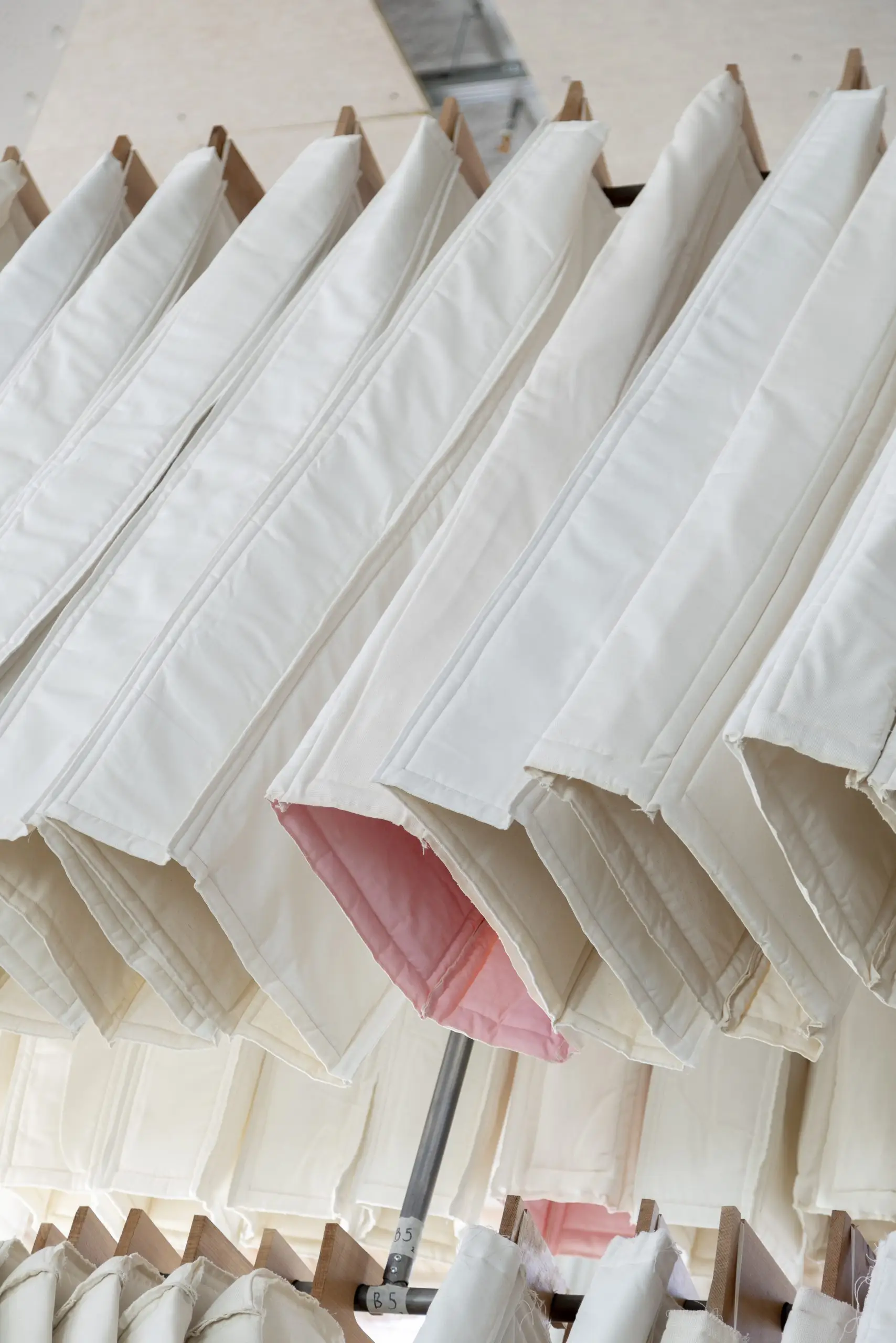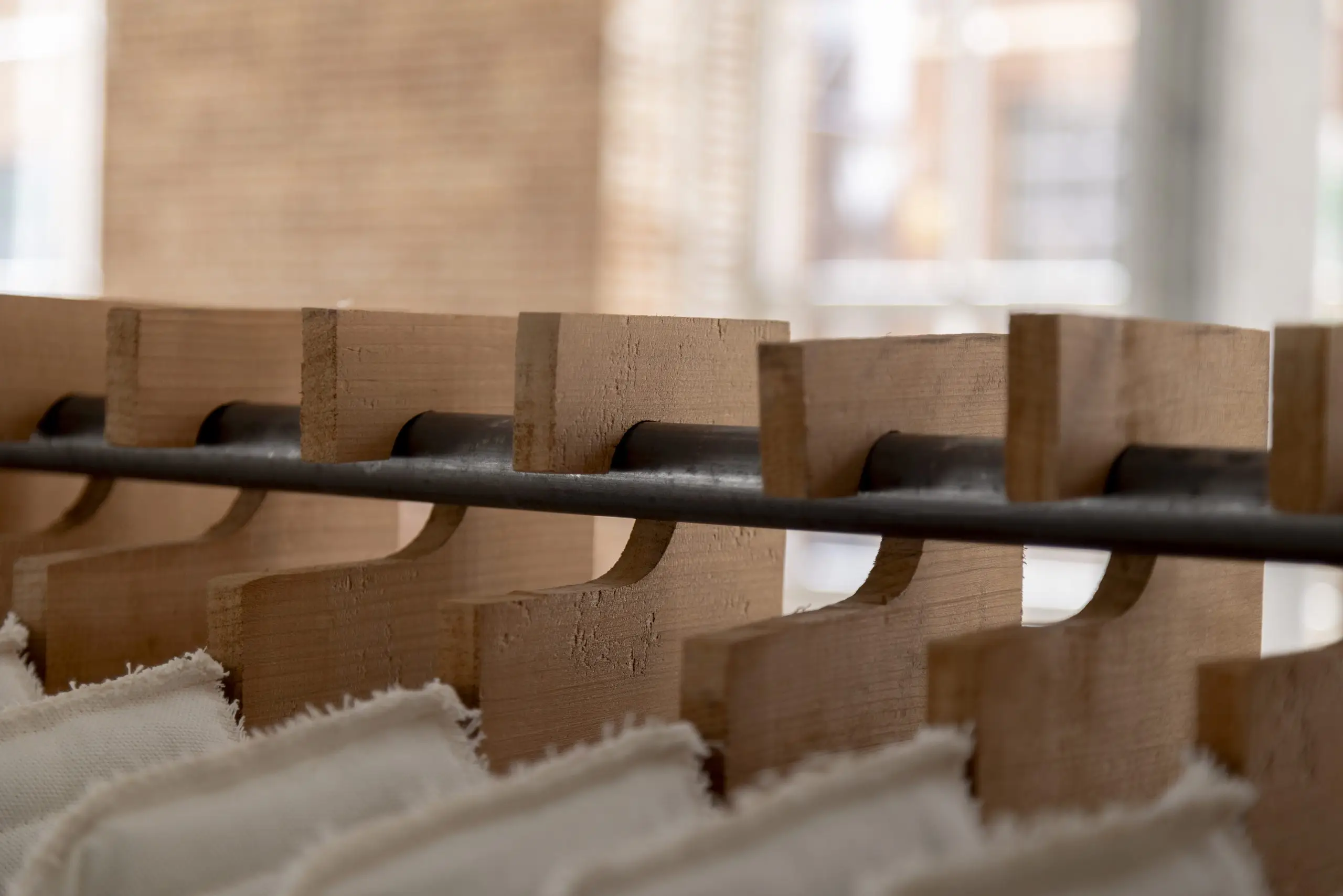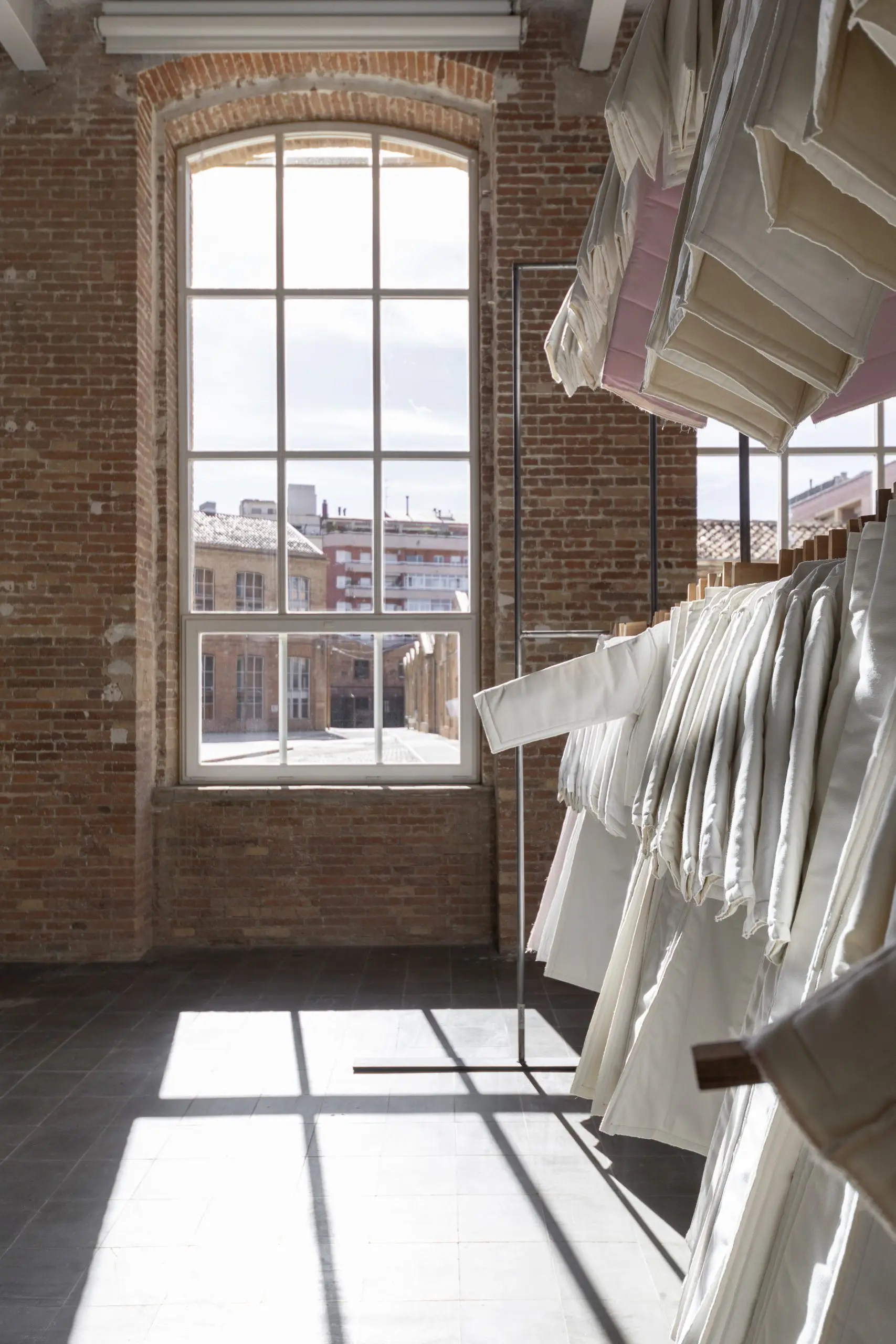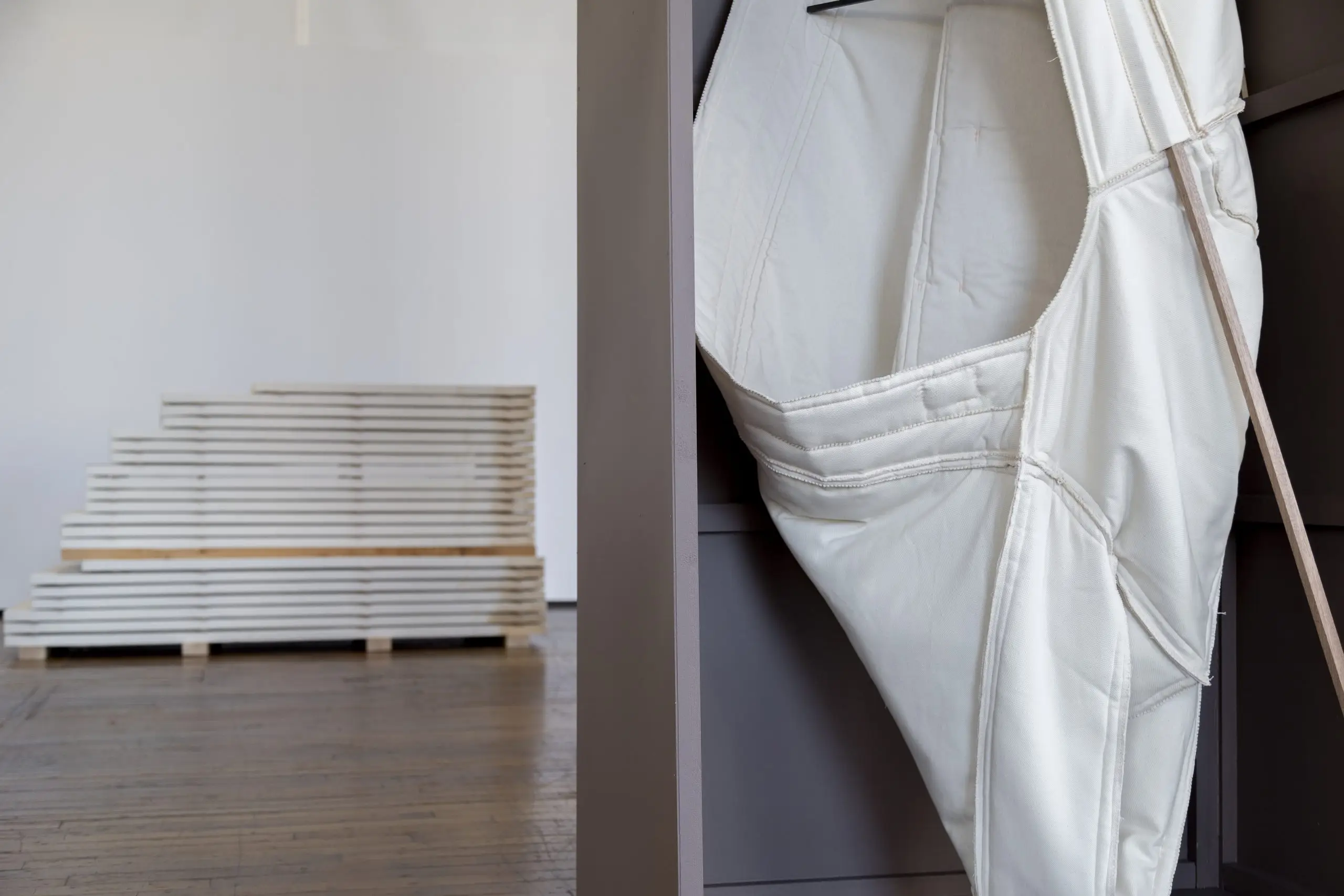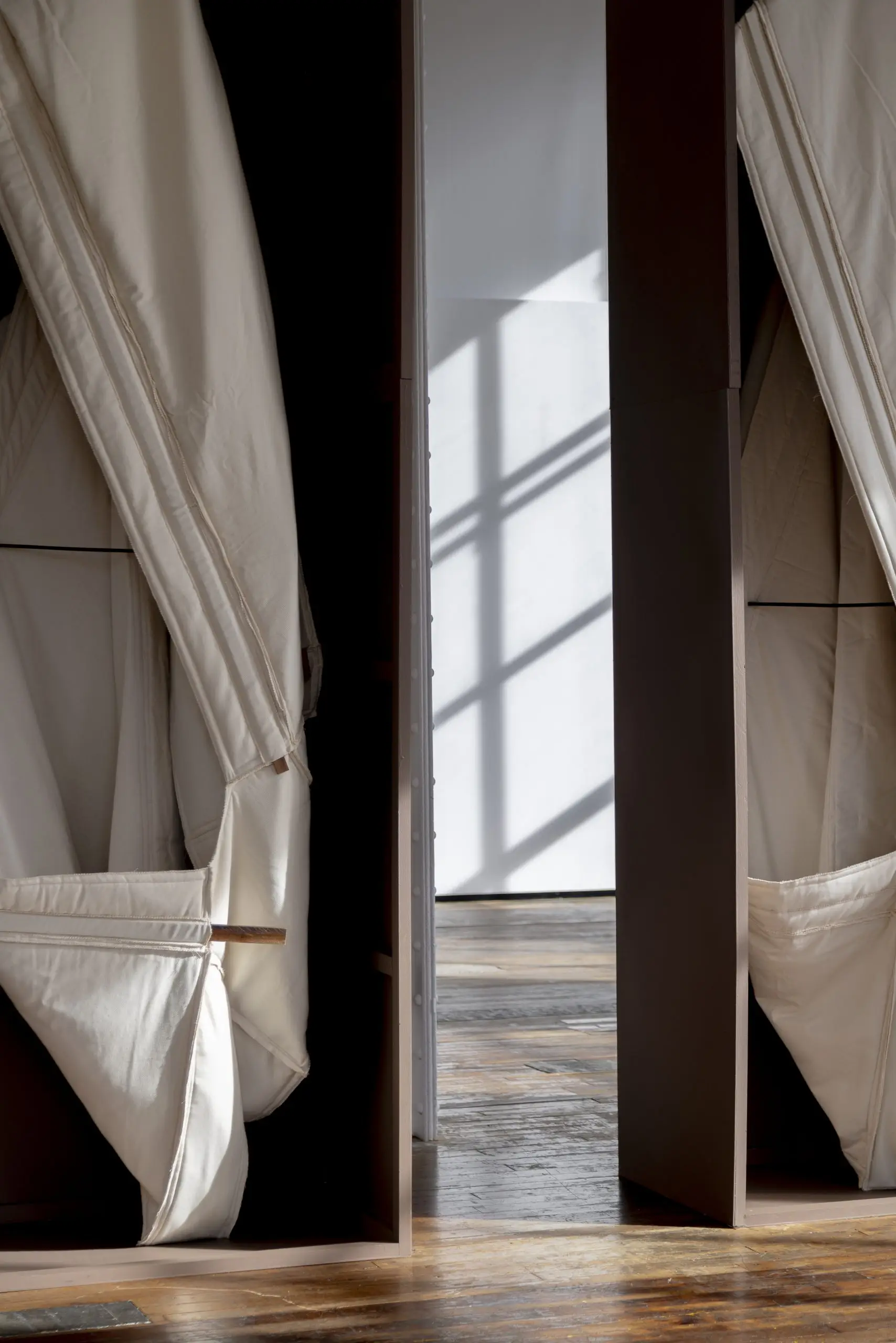 LÁIRIO de Fuentesal Arenillas, com curadoria de Claudia Elies, é uma exposição que se articula em torno de uma acumulação de peças têxteis, dispostas entre pilares e vitrines como uma grande coluna vertebral. O trabalho realizado pelas artistas foi sendo filtrado ao longo de todos estes anos, formando modos de entender a prática escultórica como uma aprendizagem coletiva adaptada a uma perda constante da forma.