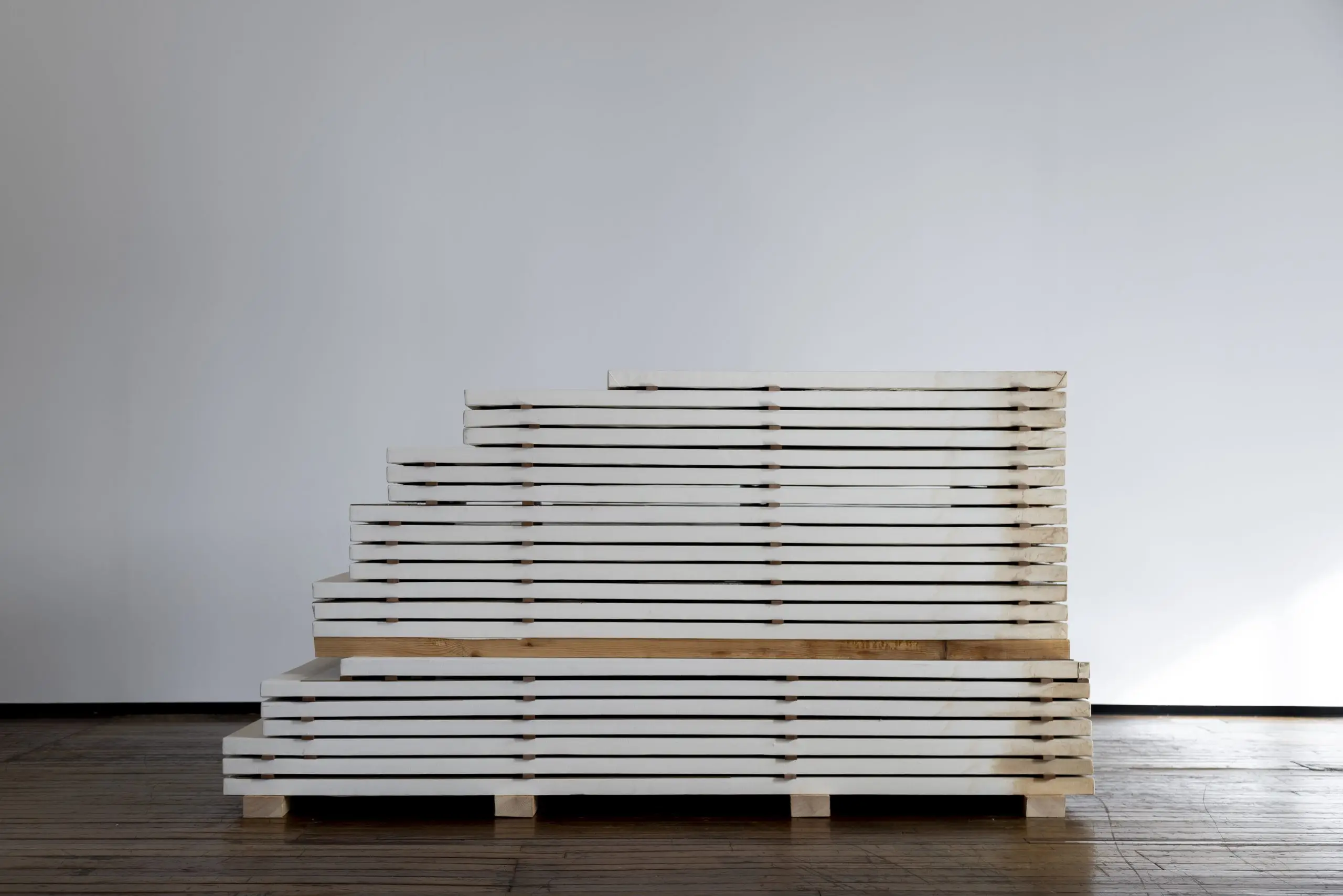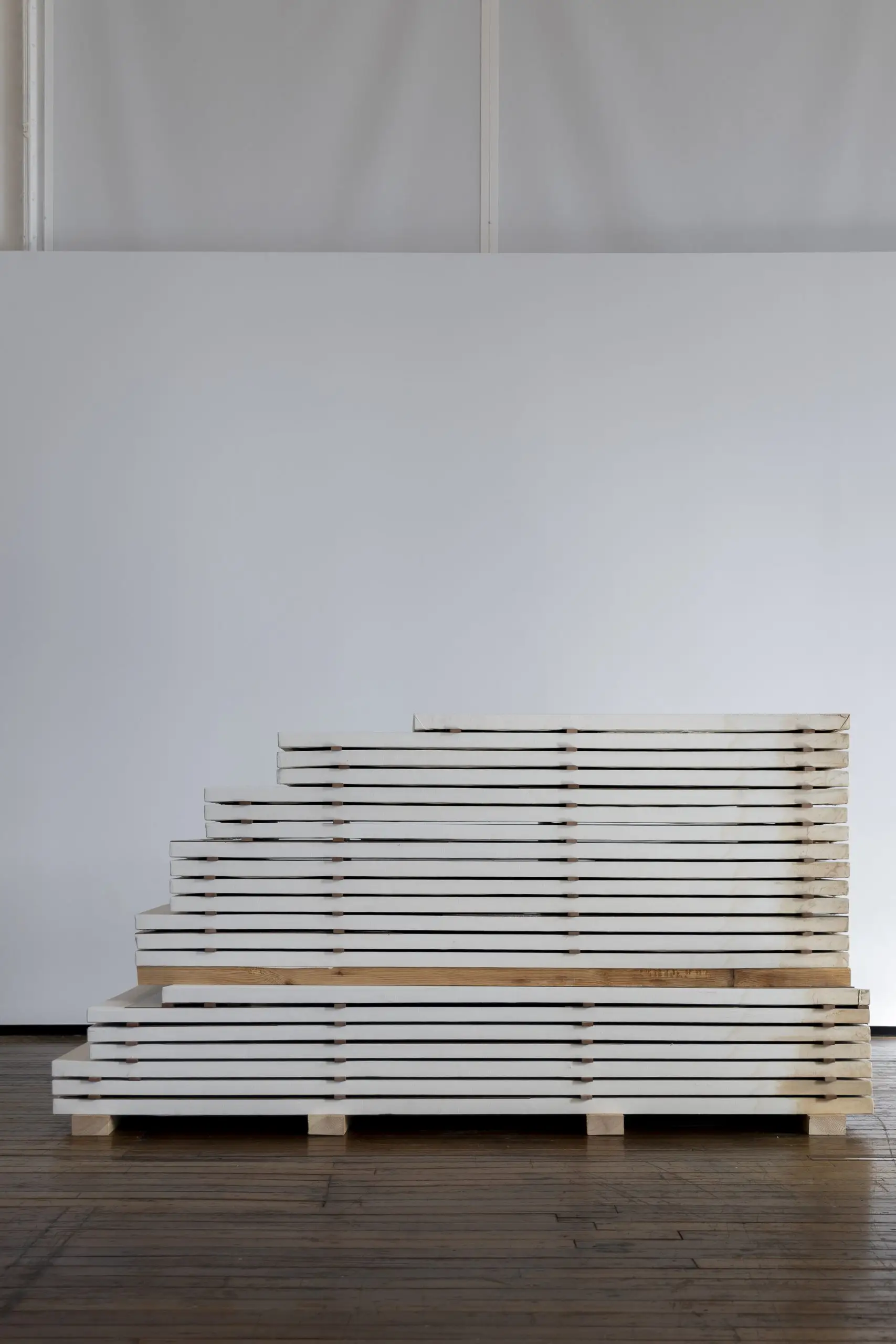 Partindo dos mesmos padrões e cortes das peças-cartão que compõem Carrossel, configura-se uma série de novas variações: Conchas. Produzidas propositadamente para a exposição LÁIRIO, as artistas manifestam uma dinâmica de múltiplas transformações e desequilíbrios em que não existe uma posição final. Articuladas no espaço, encontram-se num estado de repouso, acompanhando-se umas às outras com diferentes cargas e tensões. Estas peças sugerem outras formas de espera, outros vazios e outras maneiras de perceber novos movimentos. Gestos que remetem tanto à palavra como ao volume que se dá com o seu uso e que, com o passar do tempo, facilita a postura, o alongamento ou o seu caráter, conseguindo entrar e sair da sua cobertura, deslizando pelo cheio e pelo vazio da superfície que cai pelo seu próprio peso.