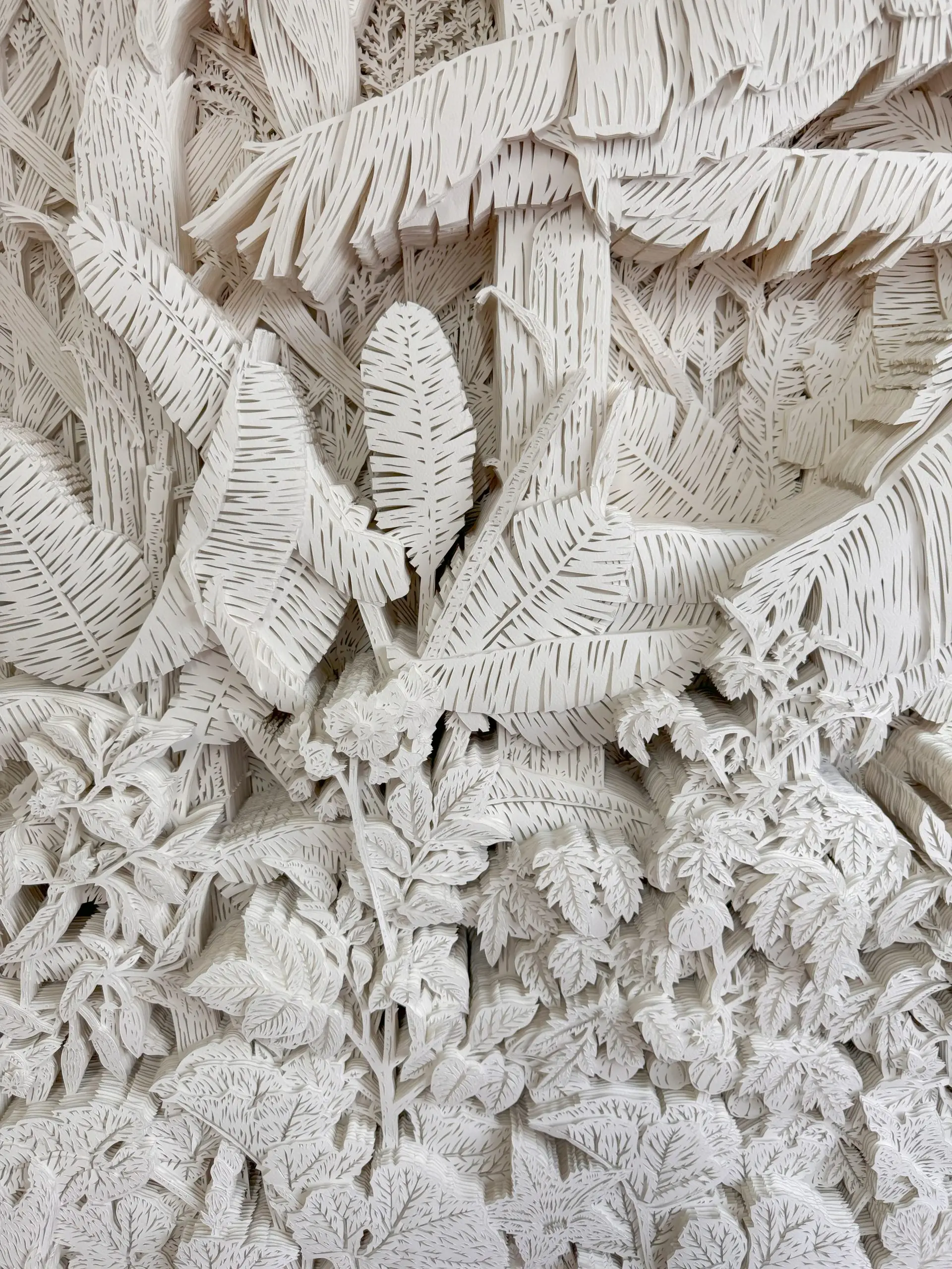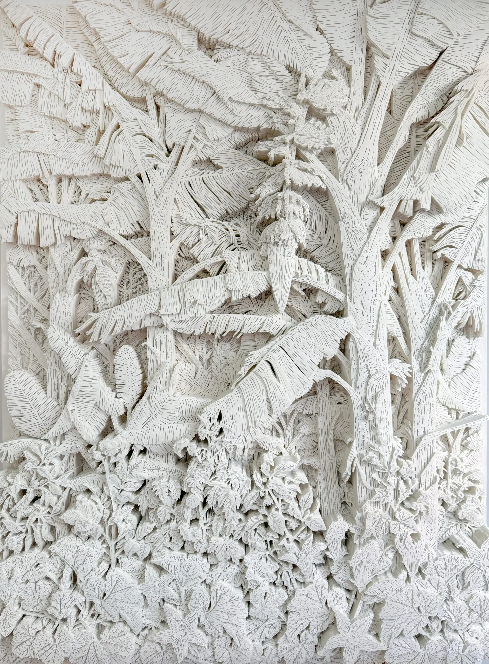 阿里亚姆娜-孔蒂诺 菜园, 2025手工裁切纸张 / 法布里亚诺300克冷压无酸纸水彩纸板与博物馆玻璃200 x 150 厘米(78.7 x 59 英寸) 菜园可被理解为一道敞开的门槛,引导我们的视线穿过交织的枝叶,进入一片家园景观——香蕉、土豆、南瓜、玉米、番茄等各类果蔬作物在此共生。 这件雕塑浮雕的创作起点,源于对42层手工剪纸的精密拼贴,其素材选自精准的植物学图谱——这些物种如今已融入全球食物系统。然而在这件作品中,艺术家将它们置于菜园之中,置于家庭空间之内。 不同物种相互交织,形成一团植物线团,令人联想到上世纪巴西建筑师布尔·马克思设计的野性家居景观。. 咨询